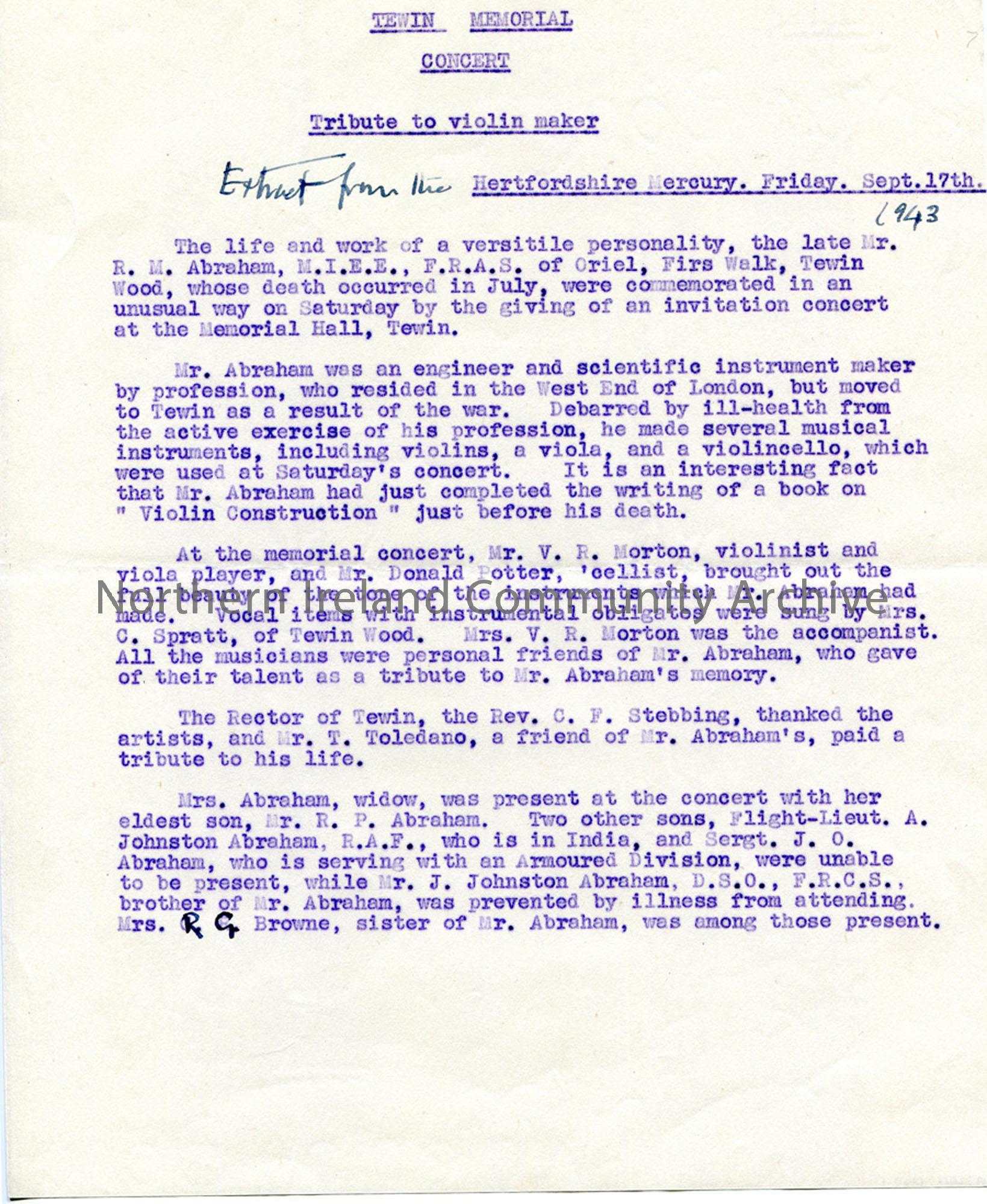 Titled 'Tewin Memorial Concert. Tribute to Violin Maker'. Re Mr R. M. Abraham. Mentions his life and work. The instruments in the concert were made by Mr R. M. Abraham. Details the concert programme.