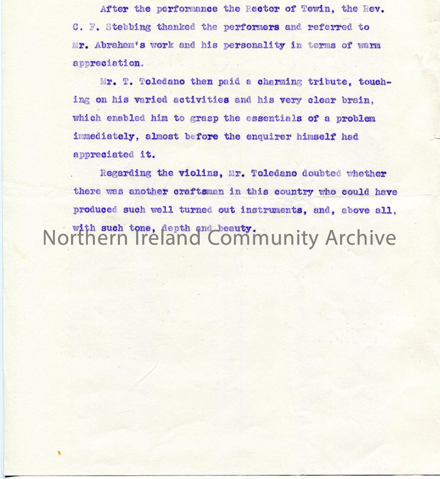 Titled 'Tewin Memorial Concert. Tribute to Violin Maker'. Re Mr R. M. Abraham. Mentions his life and work. The instruments in the concert were made by Mr R. M. Abraham. Details the concert programme.