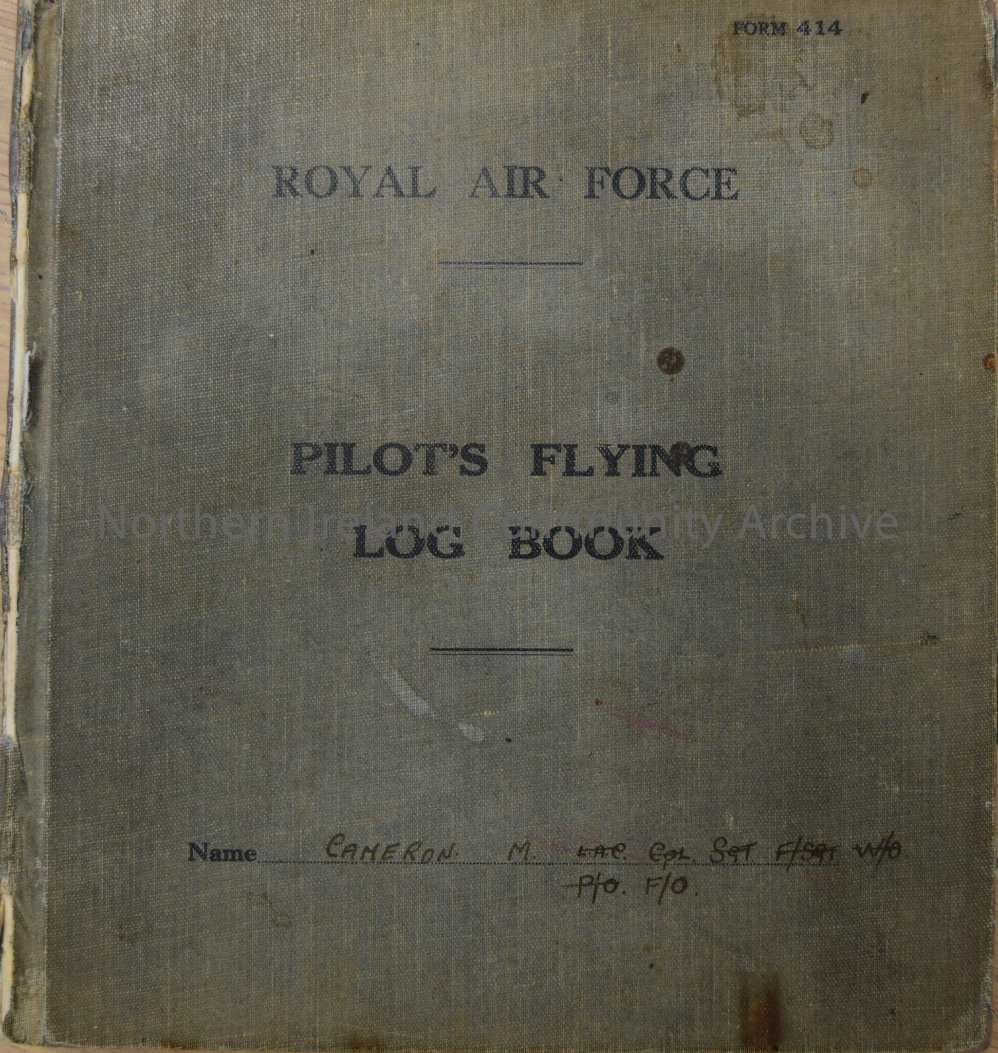 Faded blue hard back log book. Printed on the front it s 'Form 414 Royal Air Force Pilot's Flying Log Book' with the name Cameron M. L.A.E. C.P.L. S.G.T. F/S.G.T. W/O P/O F/O. Cover in poor condition with several marks and scraps on front cover. Several stains and scraps on the back cover with some around the edges. Back cover nmot as faded as the front. The log book records the aircraft type, number and engine as well as the pilot, or first pilot, 2nd pilot, pupil or passenger, and duty.