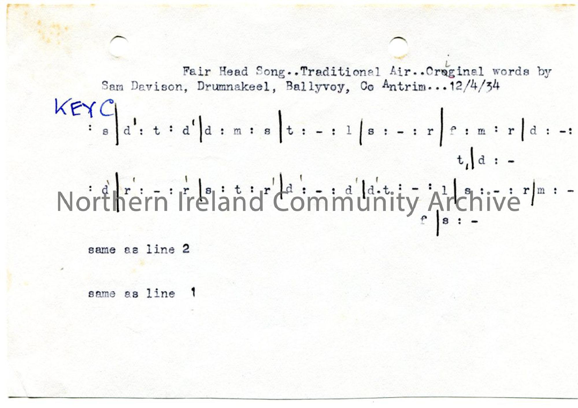 Typed tonic sol-fa notation to 'Fair Head Song' - traditional air. Original words by Sam Davidson, Drumnakeel, Ballyvoy, Co. Antrim... 12/4/1934.