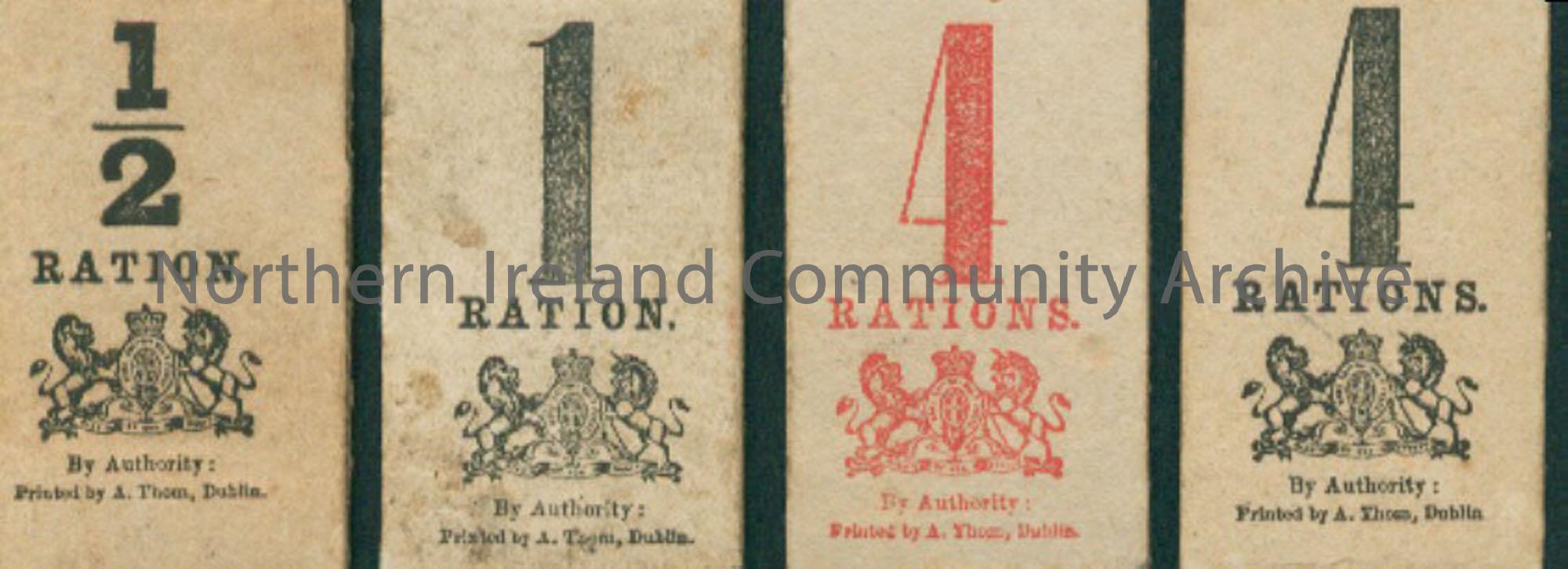 Famine ration ticket, c.1847. Red print ‘4 ration By Authority: Printed by A. Thom, Dublin.’ issued for use in the soup kitchens, Ballymoney, during t…