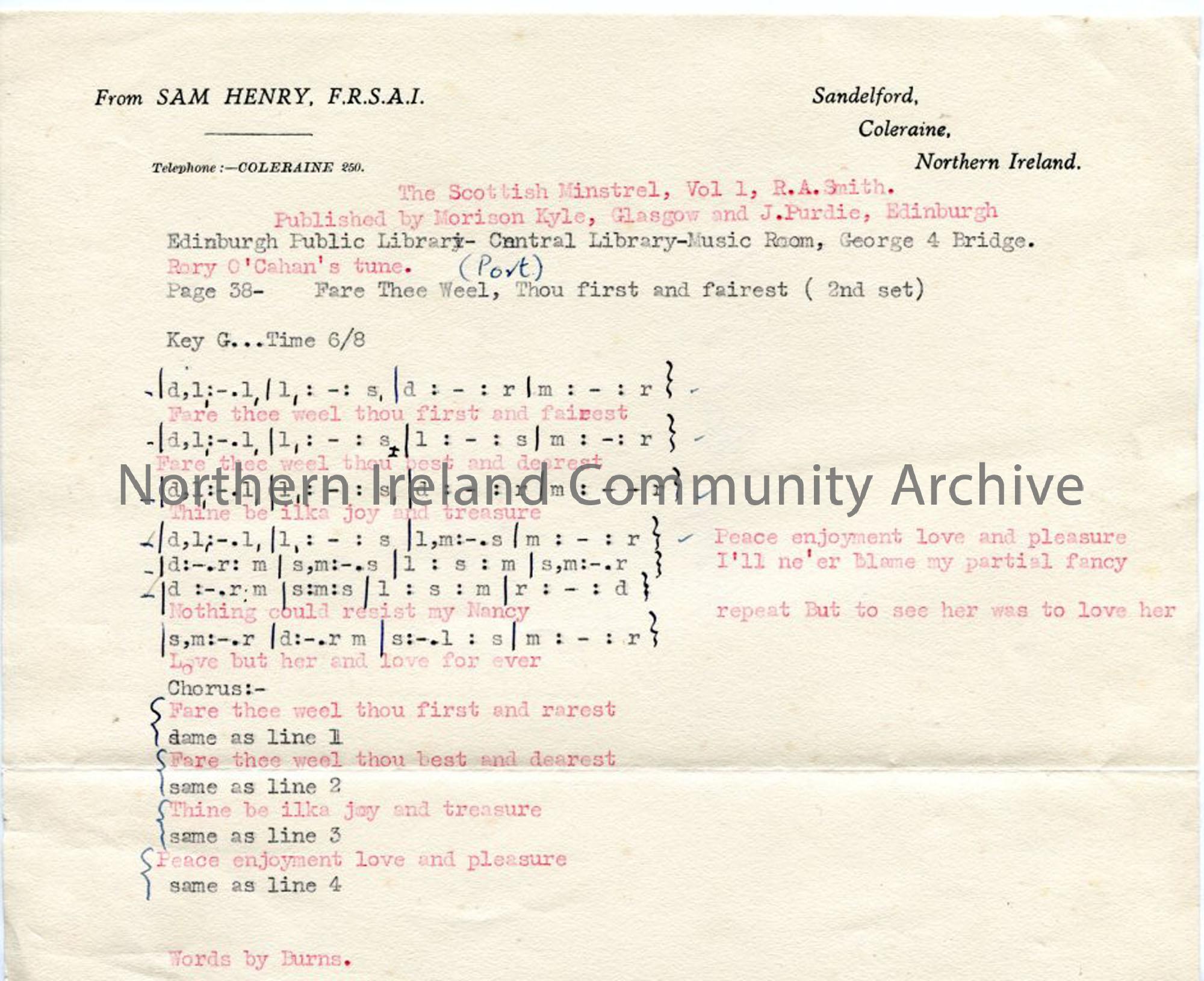 Typed tonic sol-fa notation and words to 'Fare Thee Weel, Thou first and fairest'. Tune - Rory O'Cahan's 'Port'
