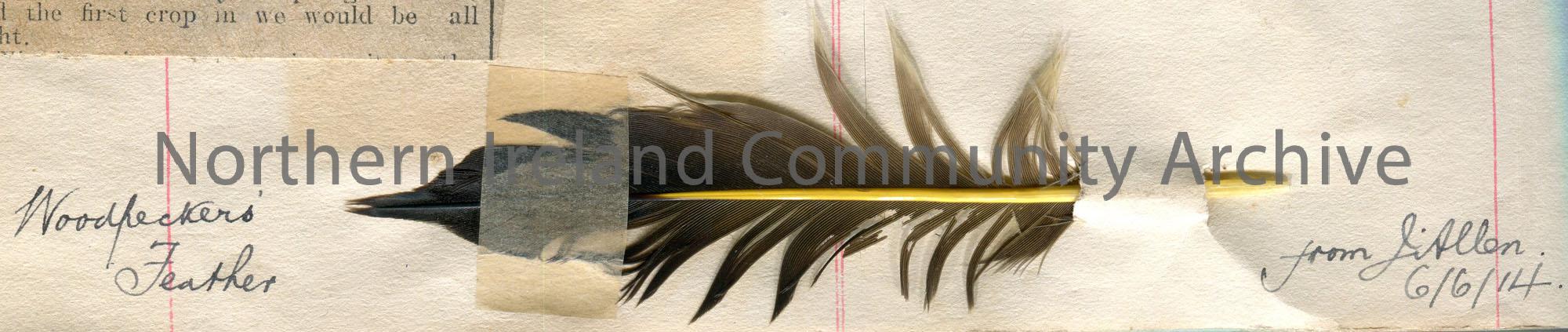 Feather of a woodpecker taped to page. From J Allen, 6/6/14.
