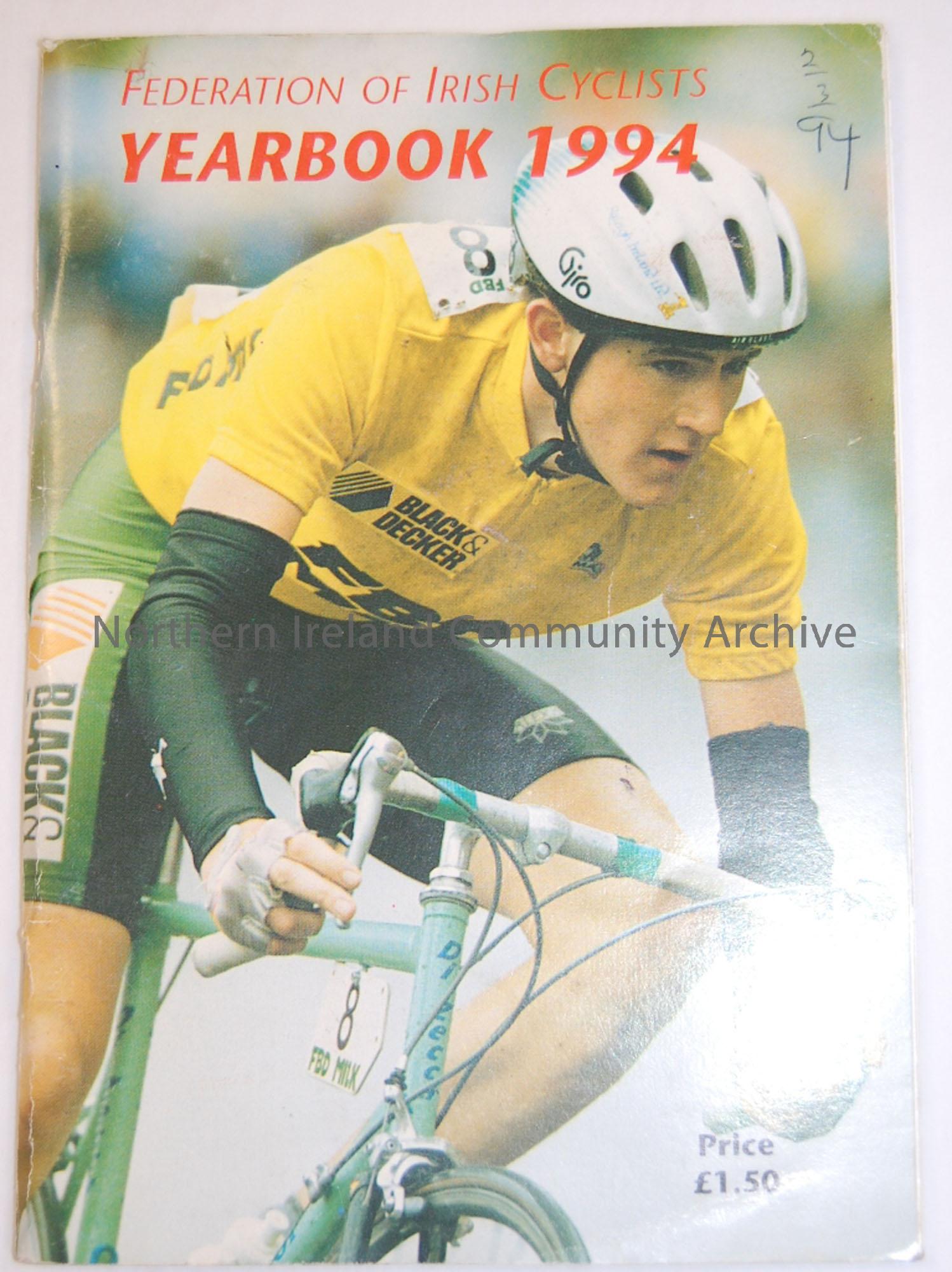 Federation of Irish cyclists 1994 yearbook. Photograph of cycle race on cover. Includes details of how to organise a race.