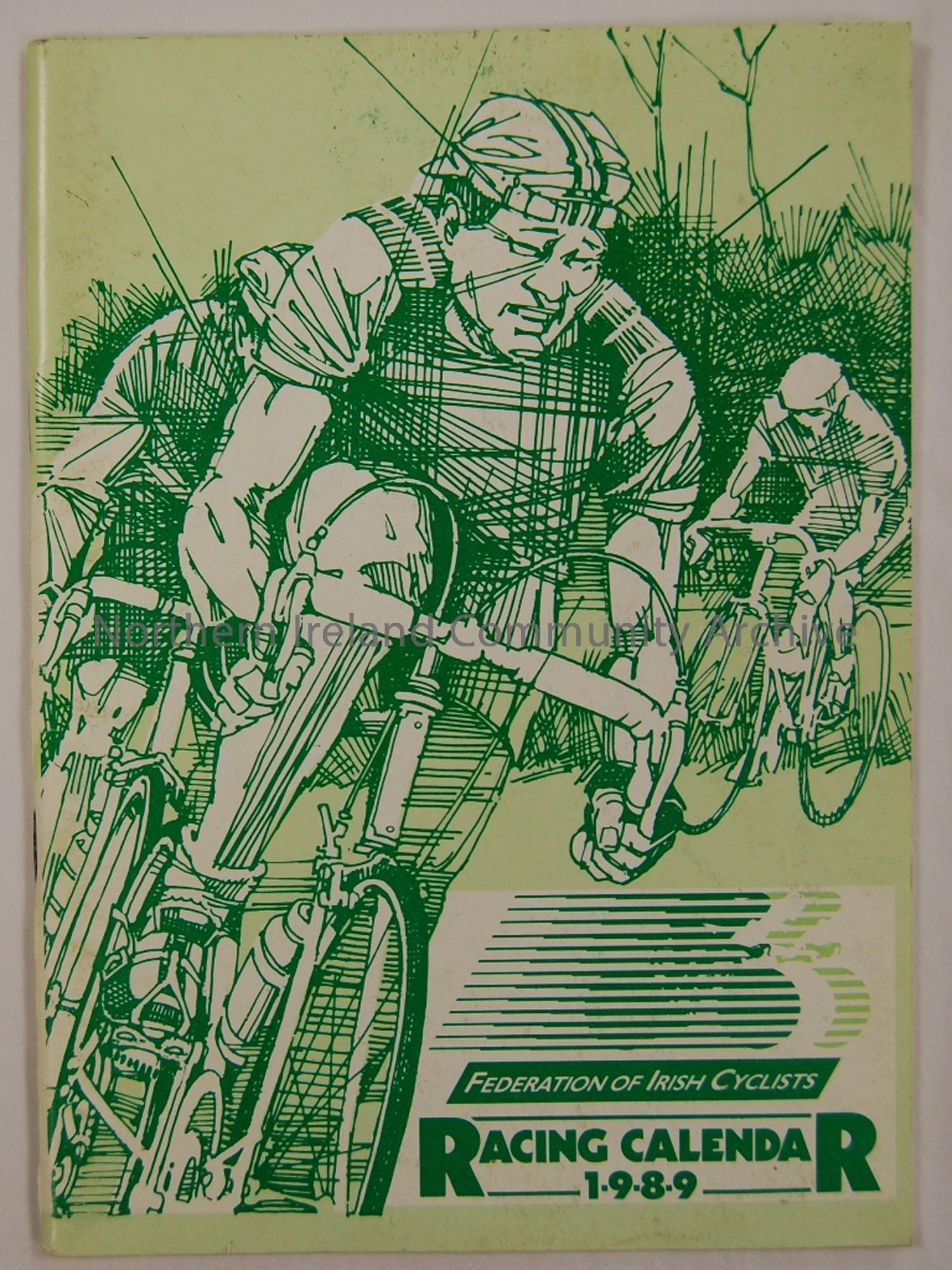 Federation of Irish cyclists racing calender 1989. stylises illustration of cyclists on cover.