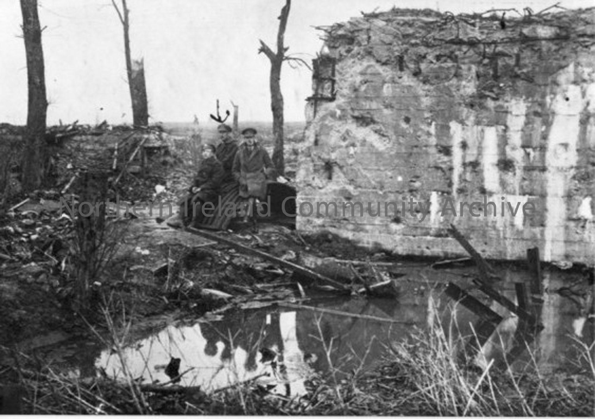 Ferghard Crossroads, Advanced Dressing Station, Major Robb (centre), with Driver Griffiths (left) and fellow surgeon Parnell (right)- These photographs are reproduced from the album of Major John C. Robb, Royal Army Medical Corps, 108th Field Ambulance, 36th Ulster Division