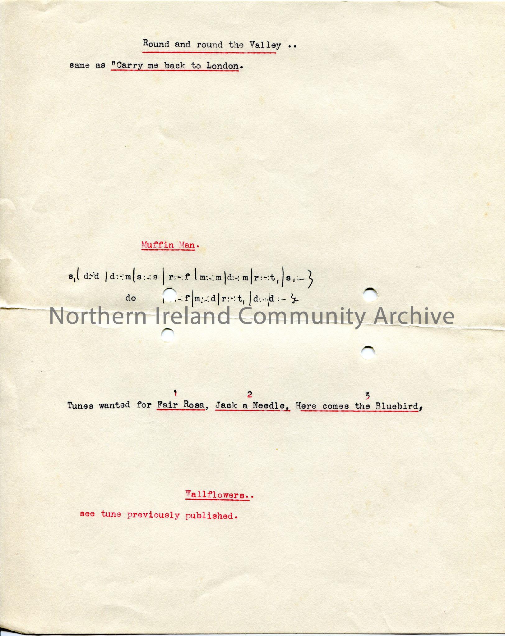 Few brief typed notes – song titles, tonic sol-fa to ‘Muffin man’, tunes wanted for verses of singing games supplied by Park Street girls (CM:2914:566…