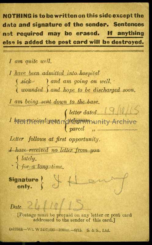 Field Service postcard. Unusually, since they were not required on field service cards, this has a red censor stamp. – 106b