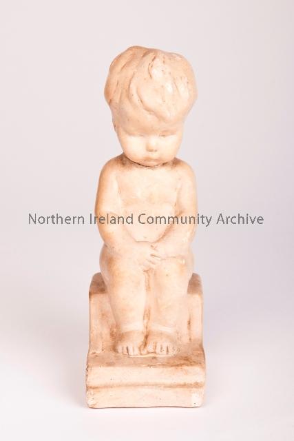6 inch high plaster figure of a child sitting on a foot stool. Courtesy of Ballycastle Museum.