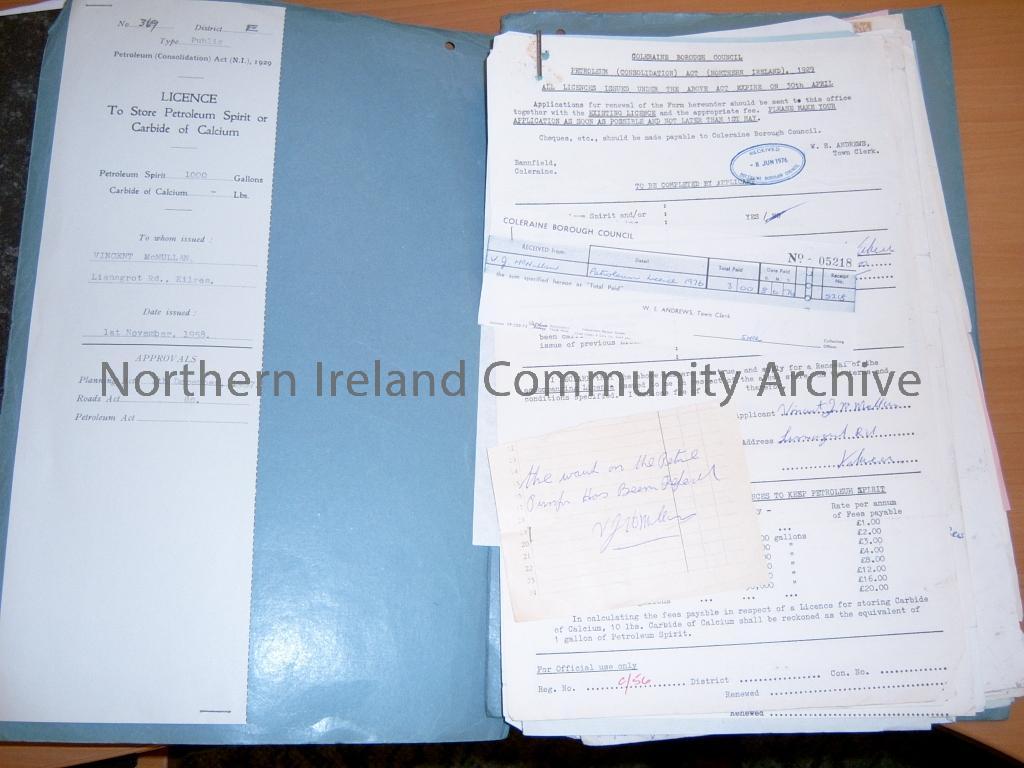 file of documents addressed to Vincent J McMullan, Lisnagroat Road, Kilrea. Contains documents re Petroleum and County Planning. Documents range from 1950’s to 1970s (6582)