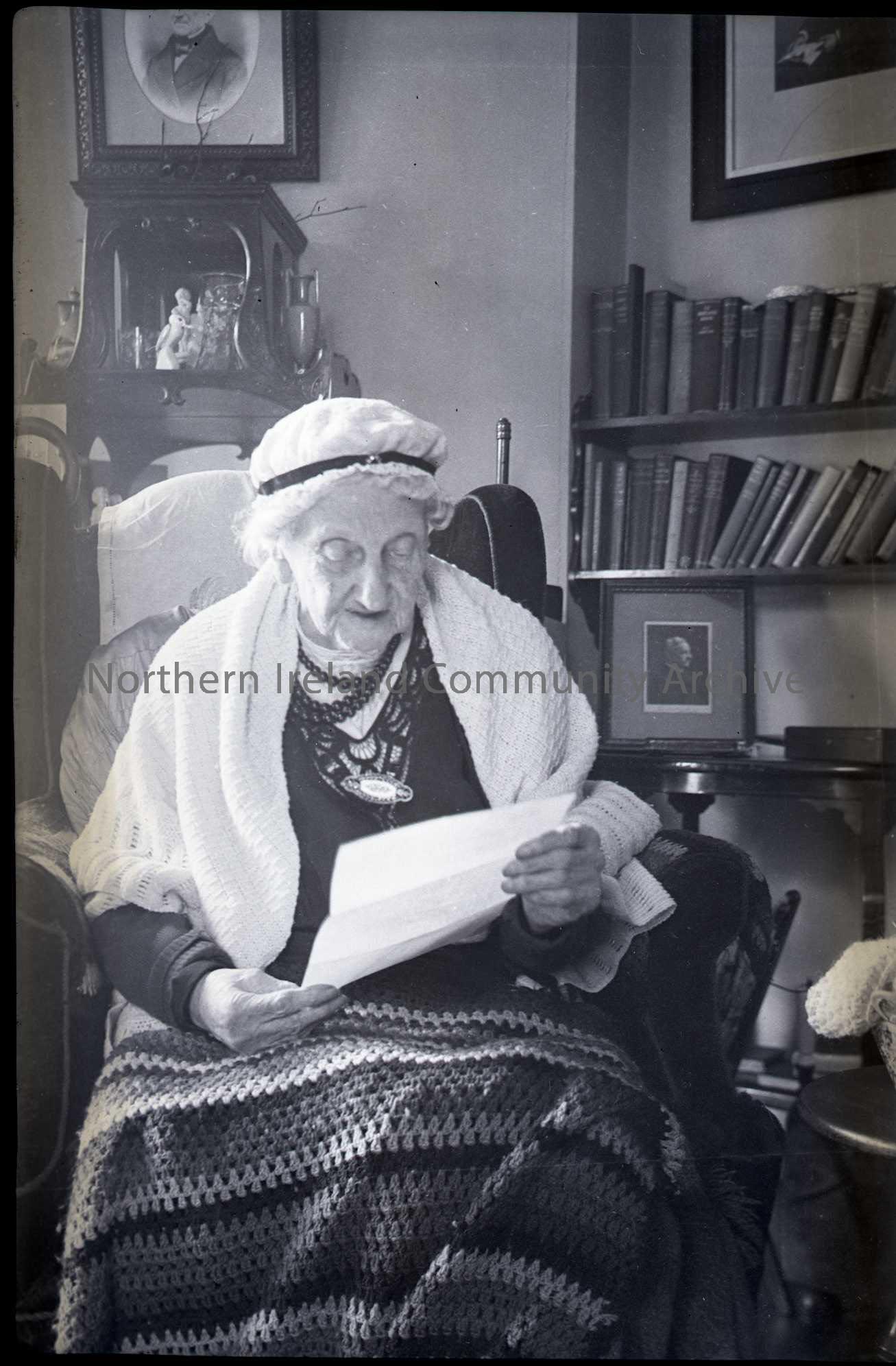 Film negative. Indoor shot of a very elderly lady in a mob cap sitting reading.