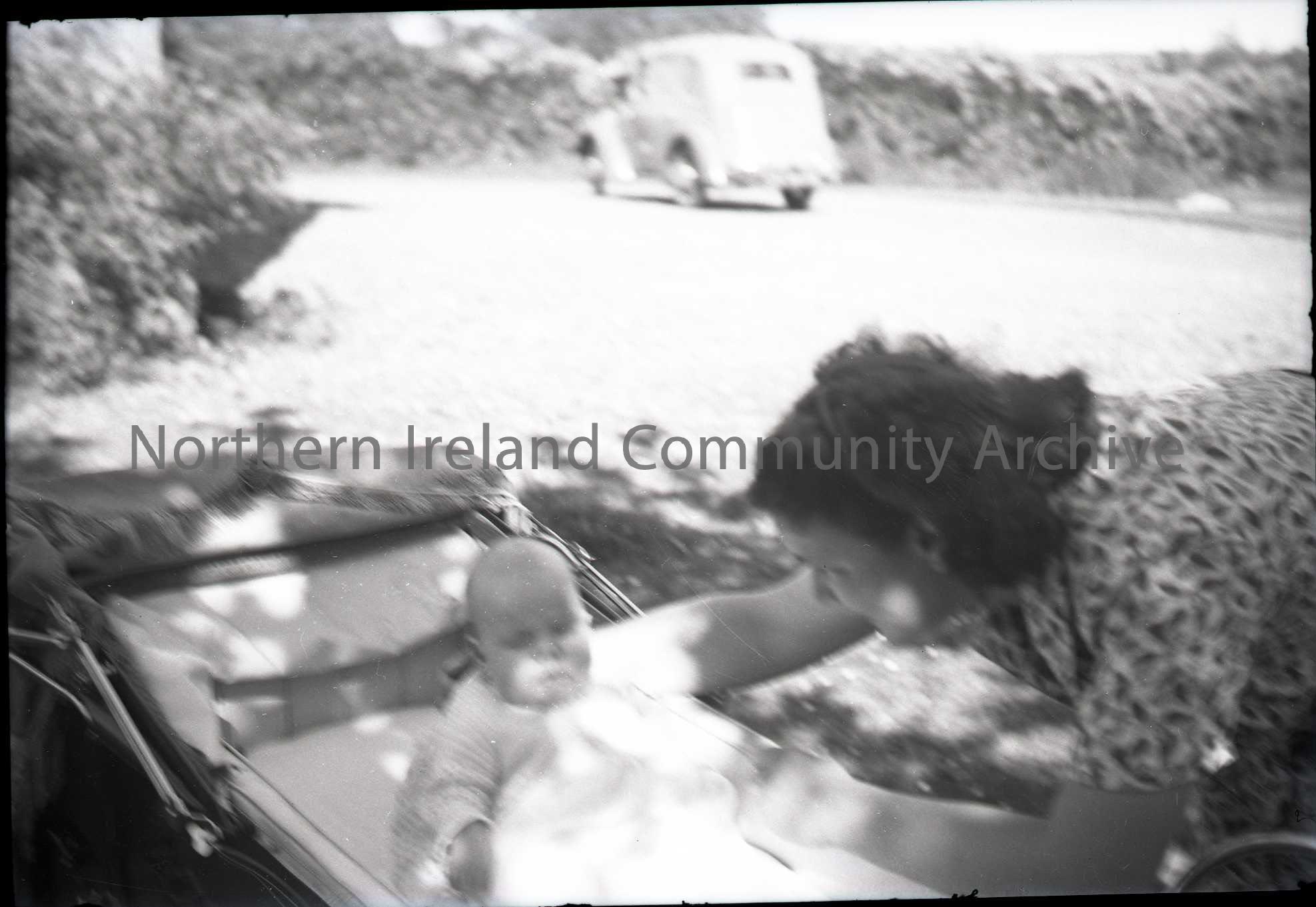 Film negative. Lady leaning over a young baby who is in a pram.