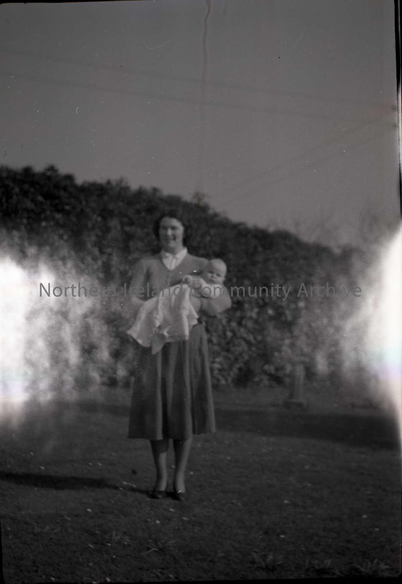 Film negative of a lady holding a baby in her arms. The photograph is taken in a garden.