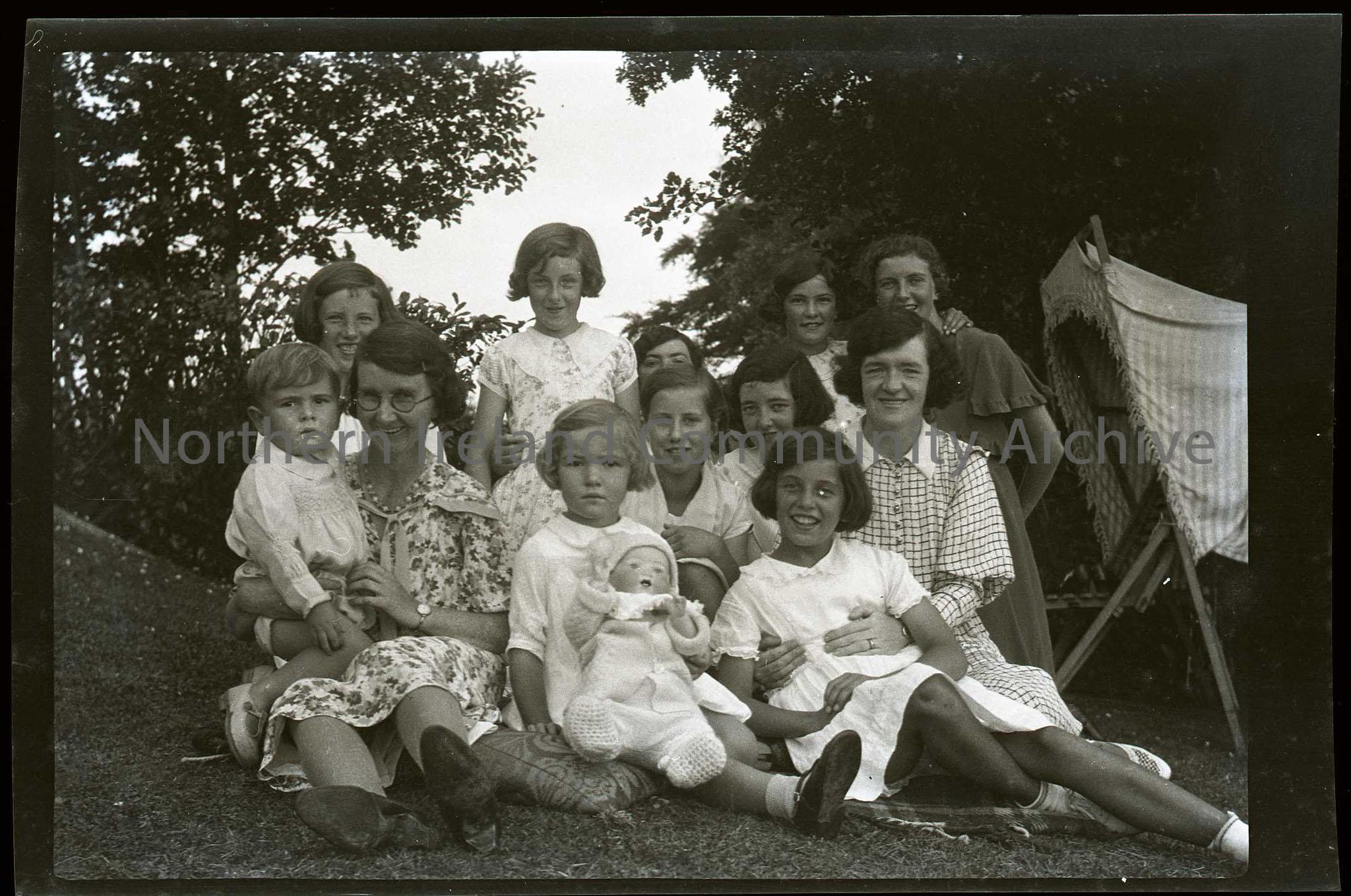 Film negative of a large group of ladies and children taken in a garden. Olive, Sam's daughter, is at the back left side.