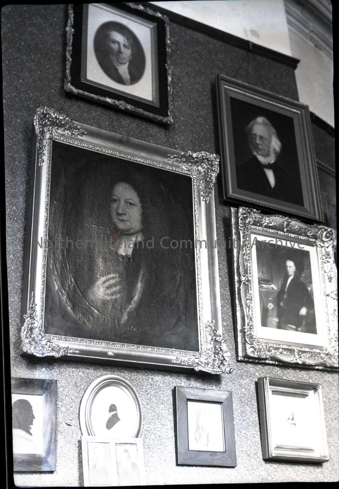 Film negative of a wall filled with old family portraits, probably taken in a stately home.