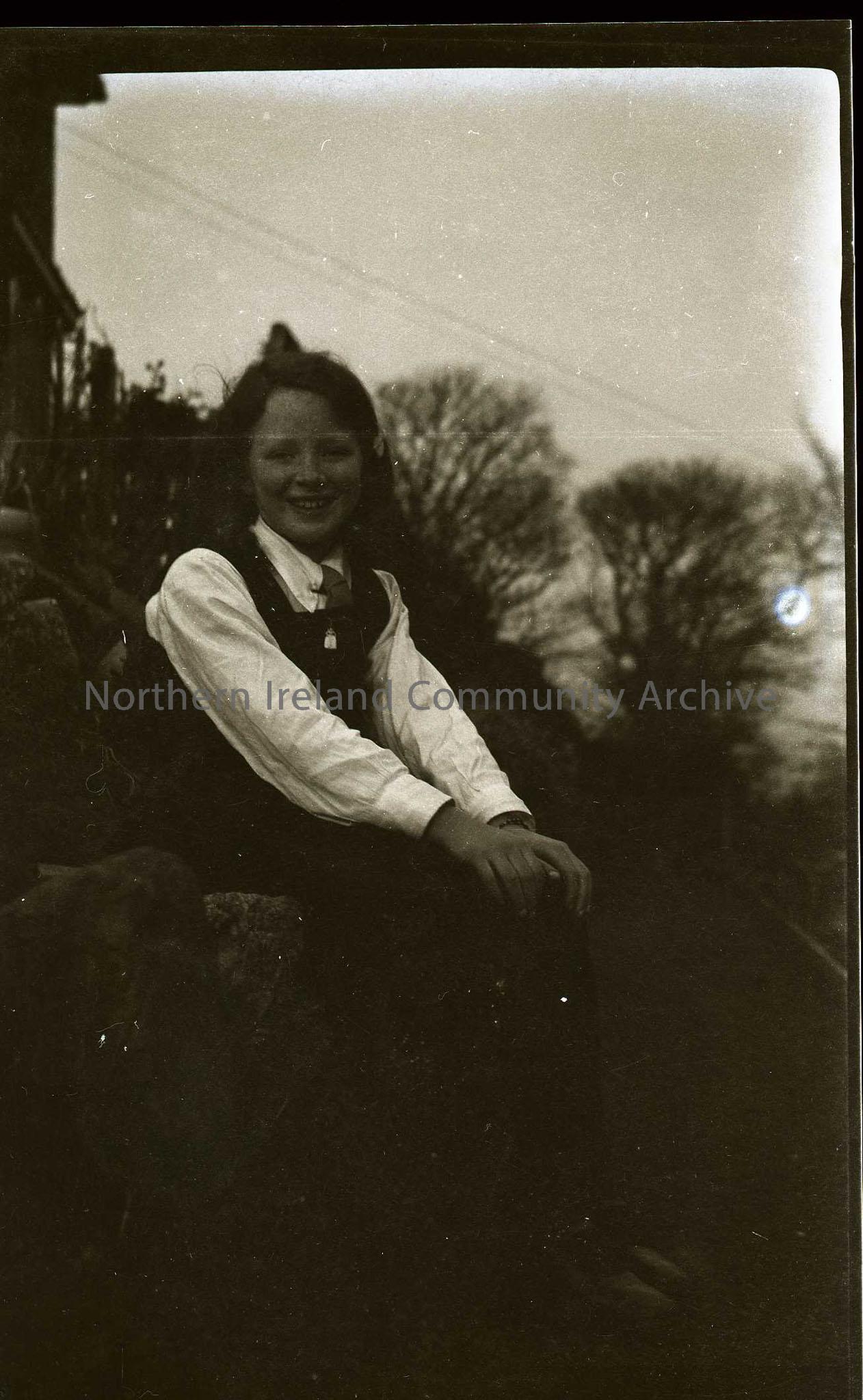 Film negative of a young girl in school uniform and sitting in a rockery.