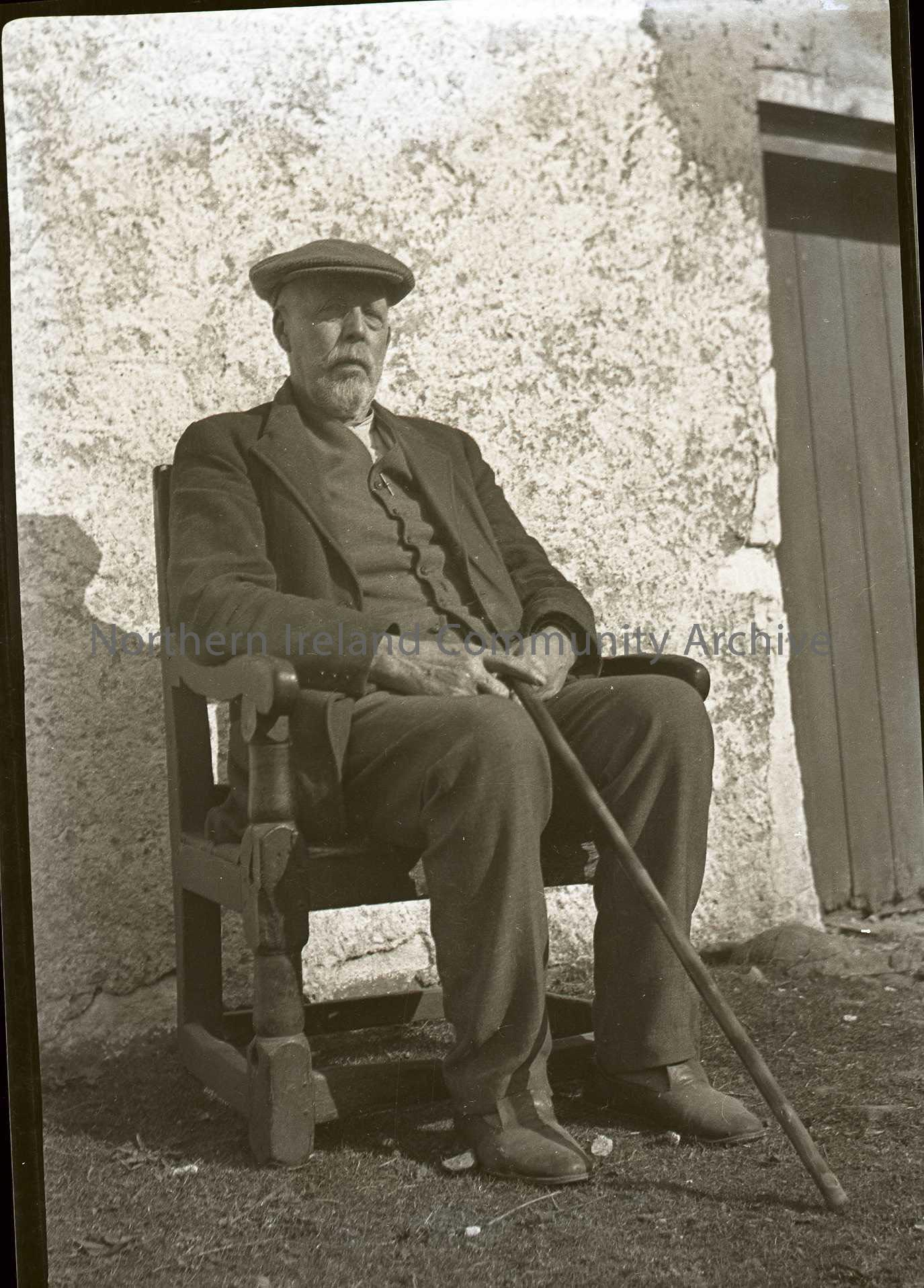 Film negative of an old man sitting on a chair outside a cottage.