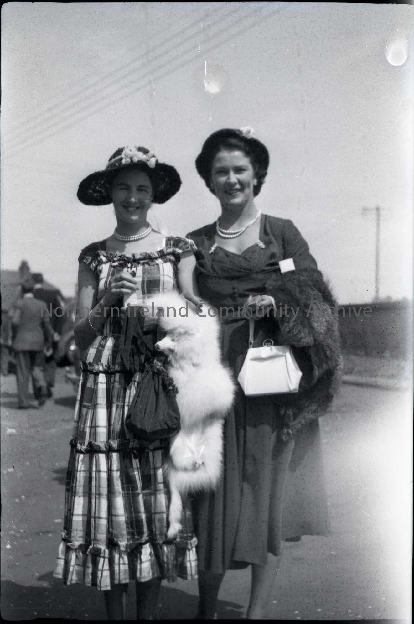 Film negative of Olive and a friend both dressed for a special occasion, possibly a wedding as there may be a church in the background and both are ho…