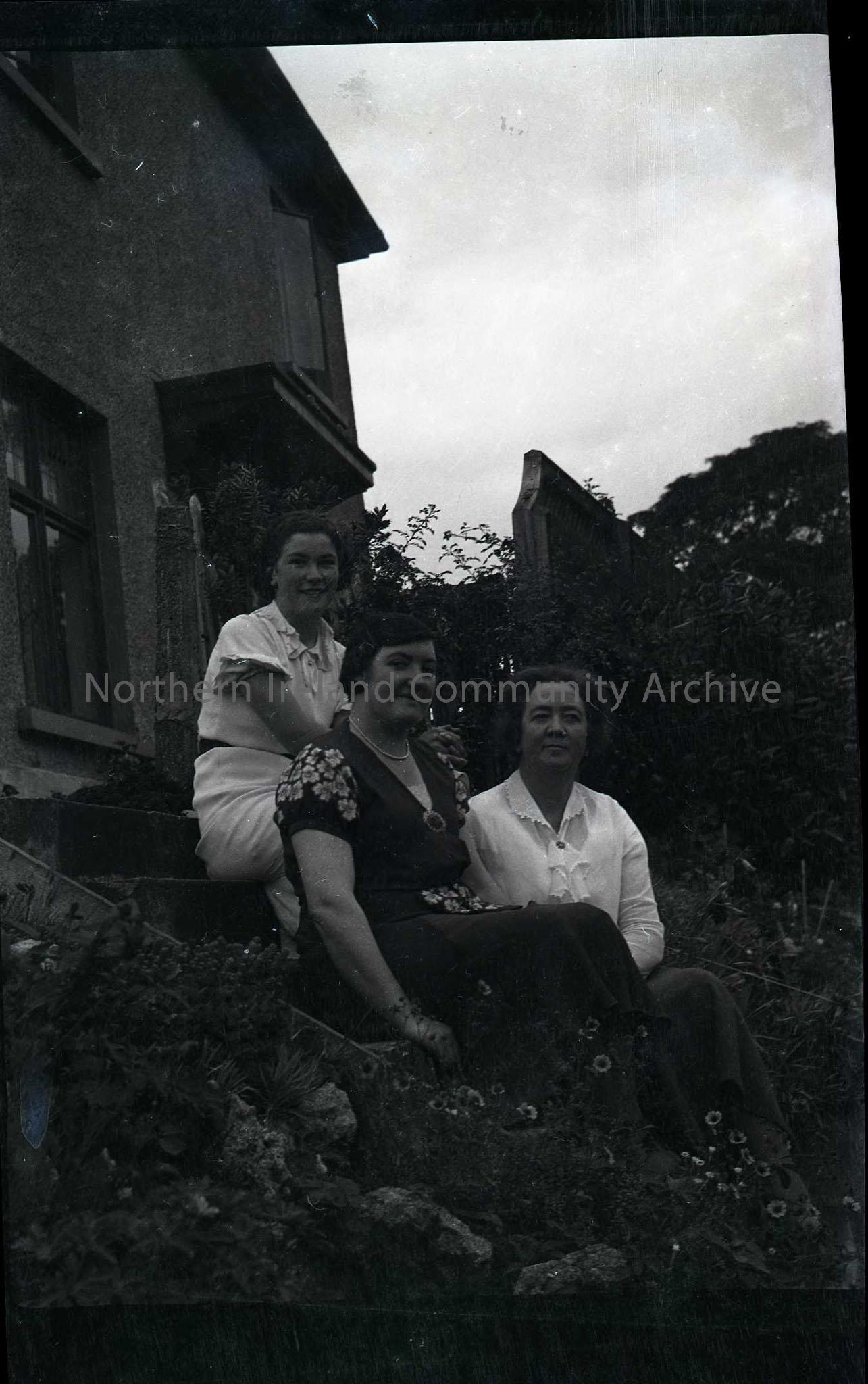 Film negative of Olive, Maimie and another lady sitting on steps in a garden.