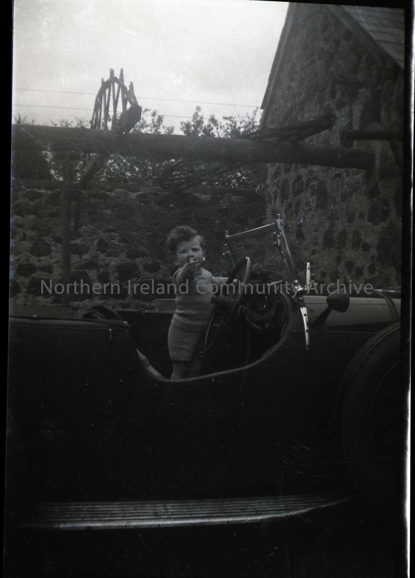 Film negative of one of Sam's grandsons standing at the steering wheel of a car.