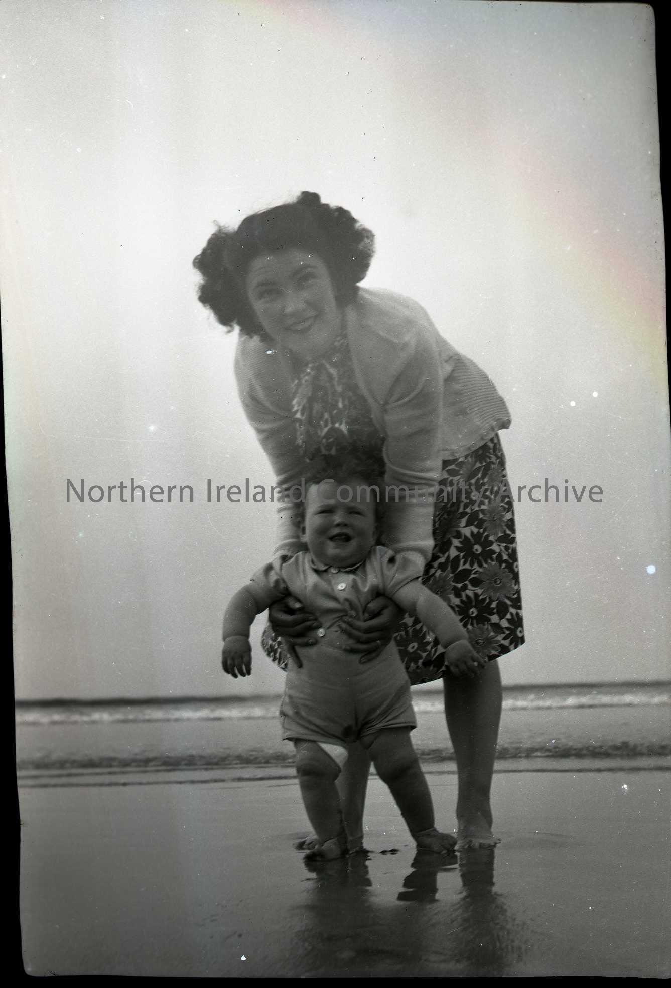 Film negative of Sam's daughter Olive and a toddler paddling in the sea.