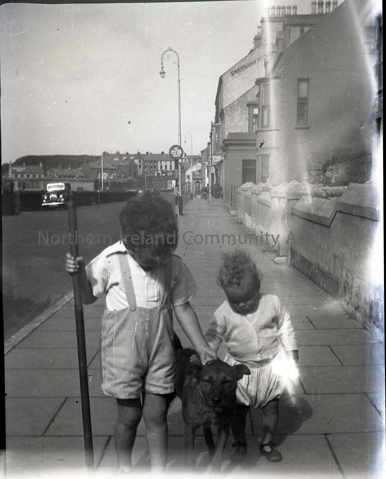 Film negative of two of Sam's grandsons with a dog. The photo is taken in Kerr Street Portrush and "Swanbank Hotel" can be seen on the gable wall of one of the buildings in the background.