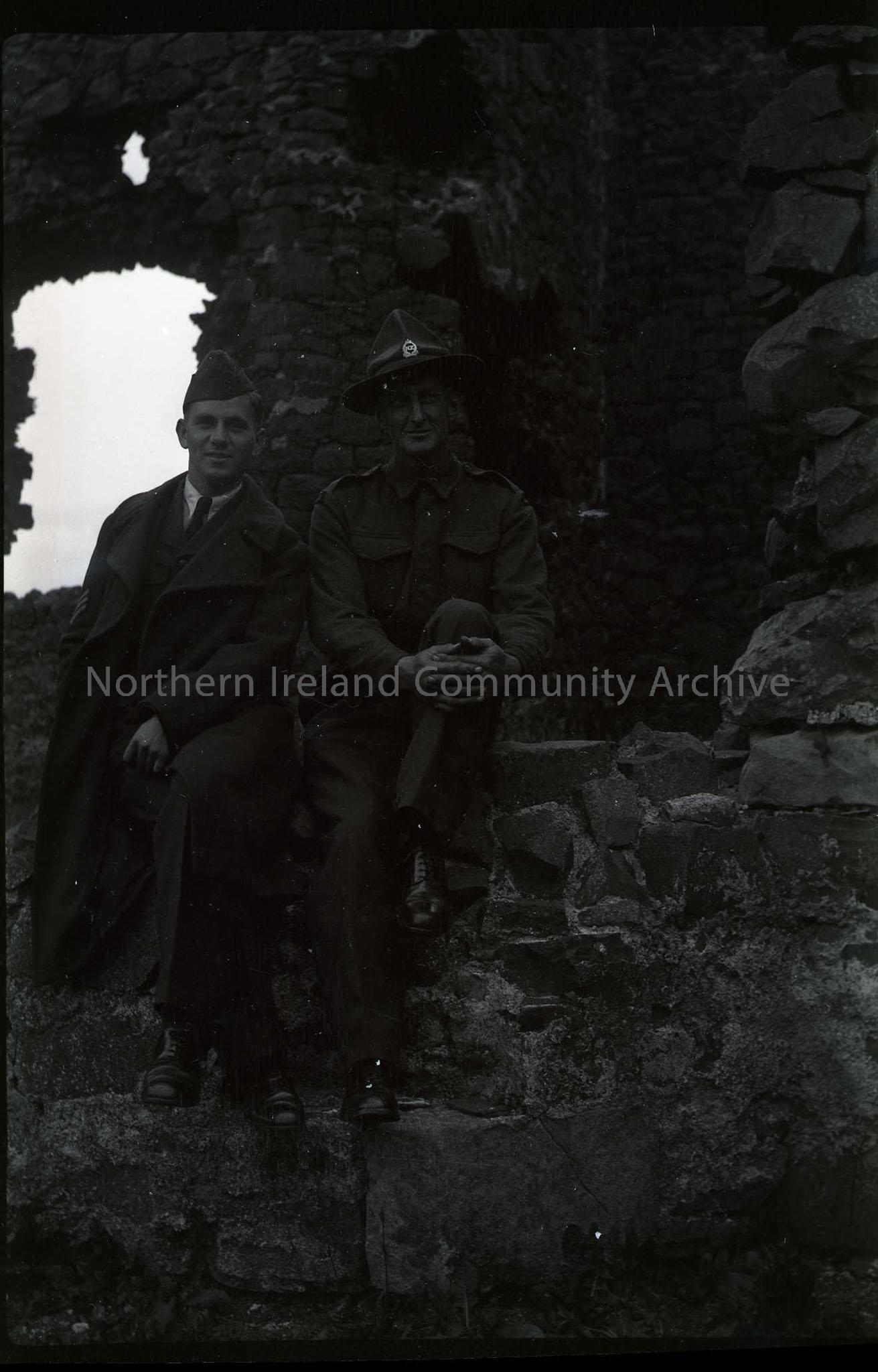 Film negative of two servicemen. It seems to have been taken at Dunluce castle.