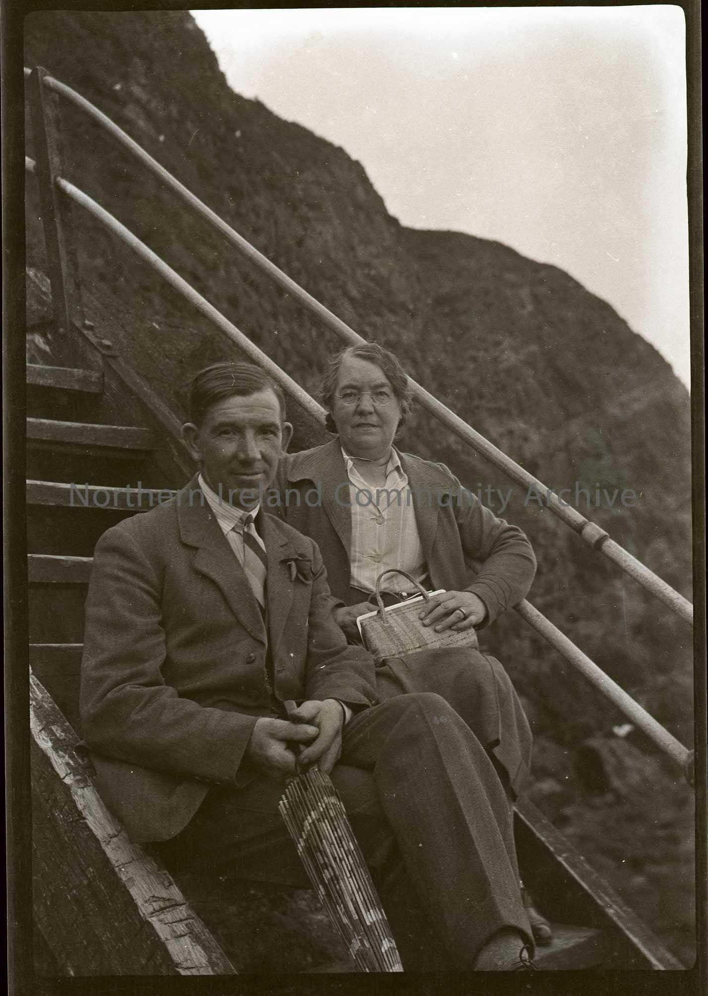Film negative. Outside shot of a lady and gentleman sitting on steps. The man is holding a parasol and there are rocks in the background.