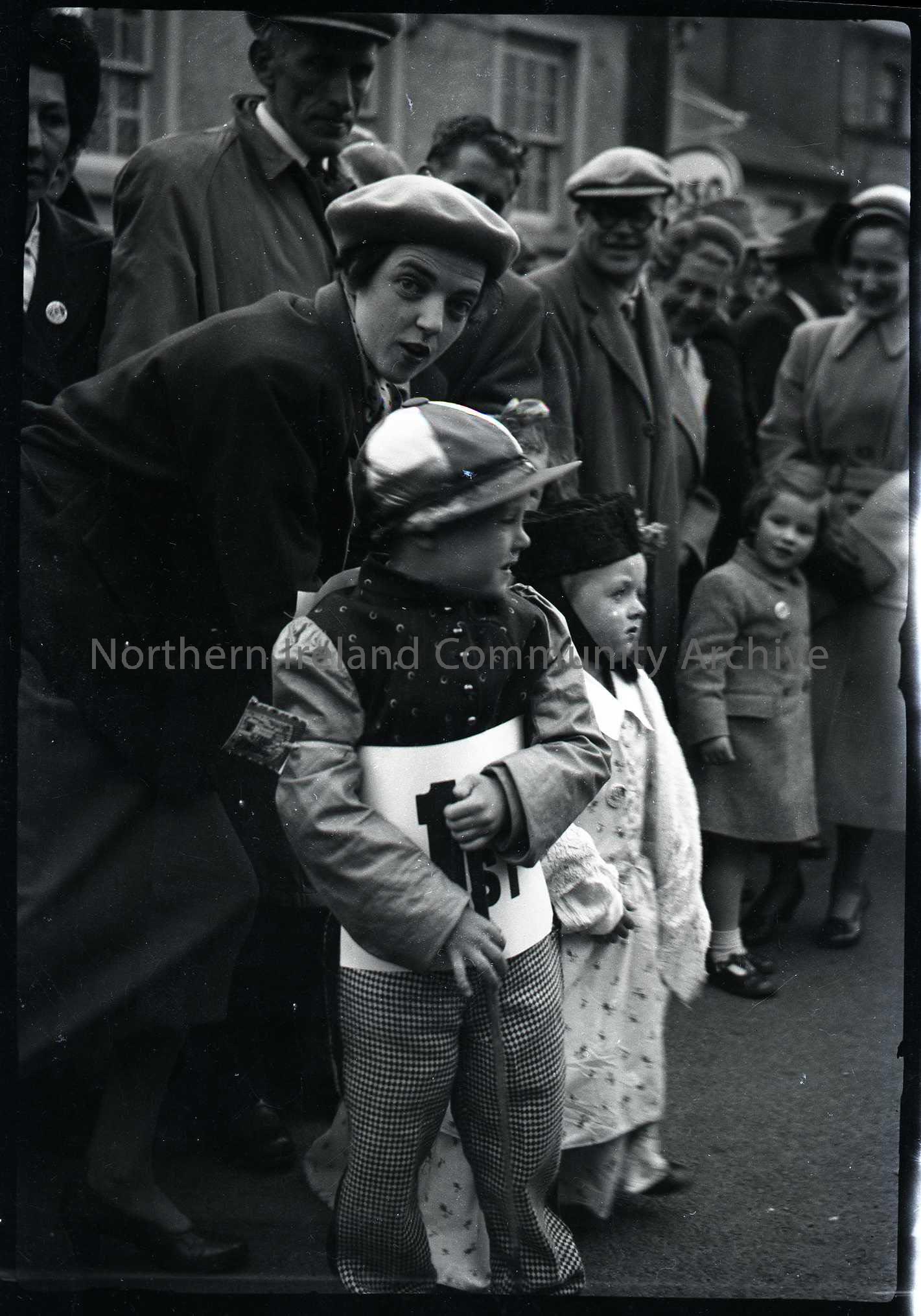Film negative. Photo of a fancy dress competition for children. The little boy in the foreground is dressed as a jockey.