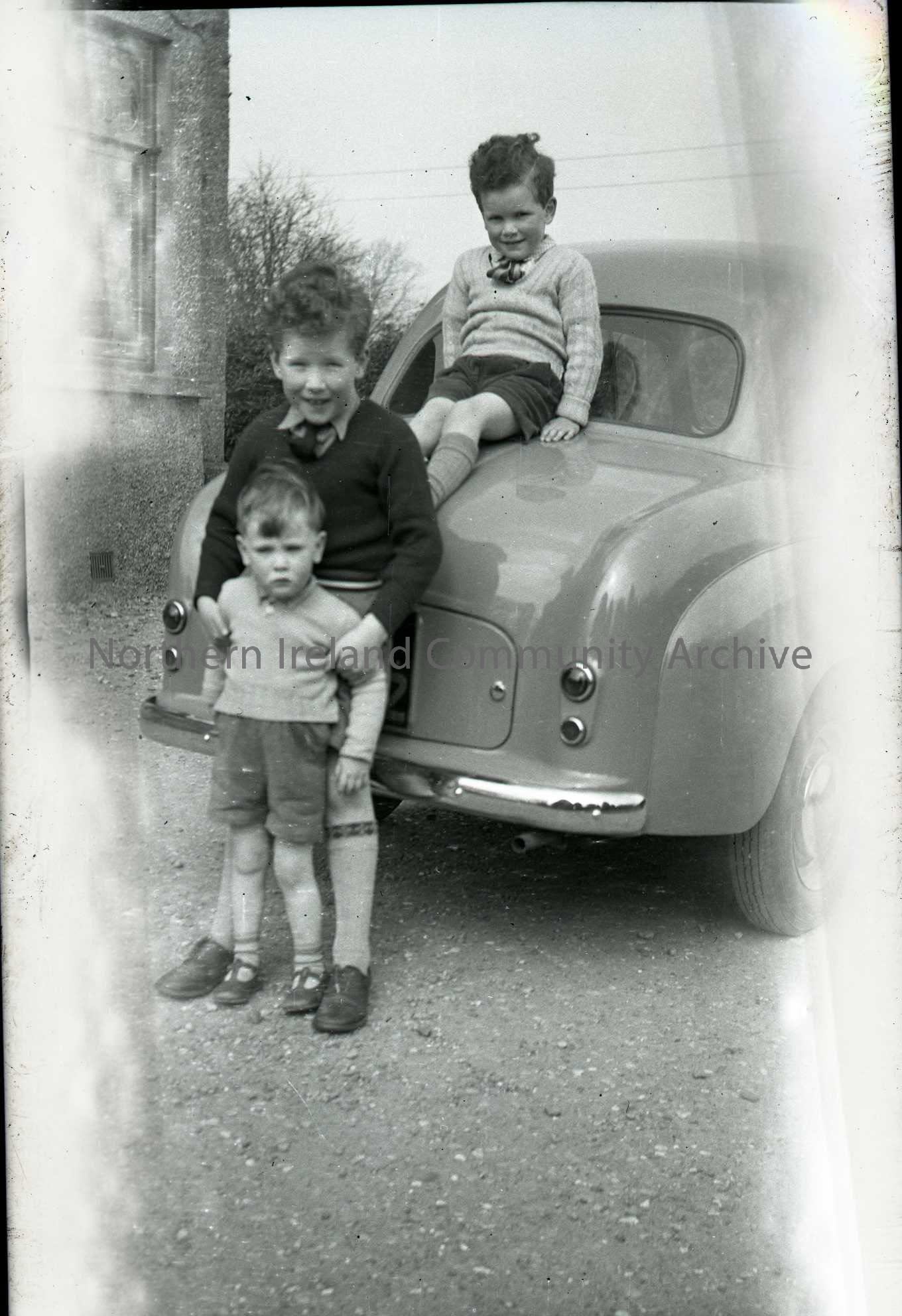Film negative. Three of Sam's grandsons, one sitting on the boot of a car with two standing in front.