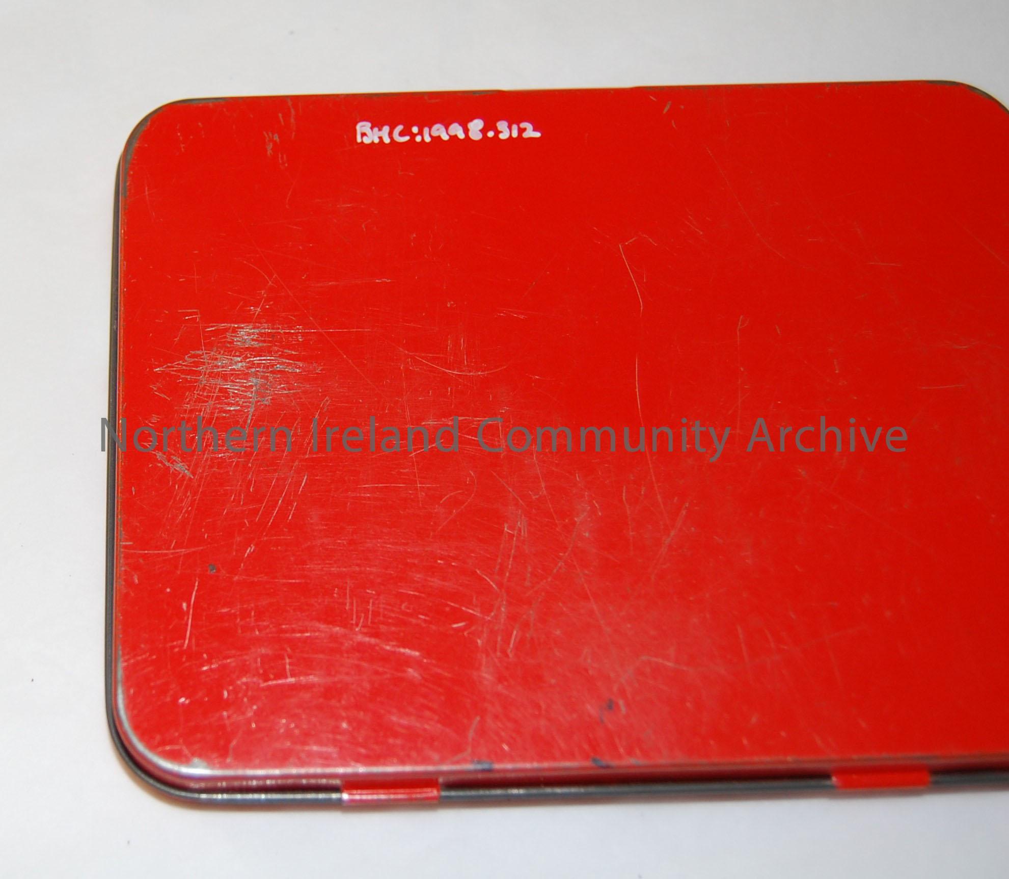 ‘First aid dressings/Elastoplast/Stretch Fabric..’. Thin flat tin container for plasters. Red background, with black and white print. c.1960s – 1998.312 (1)