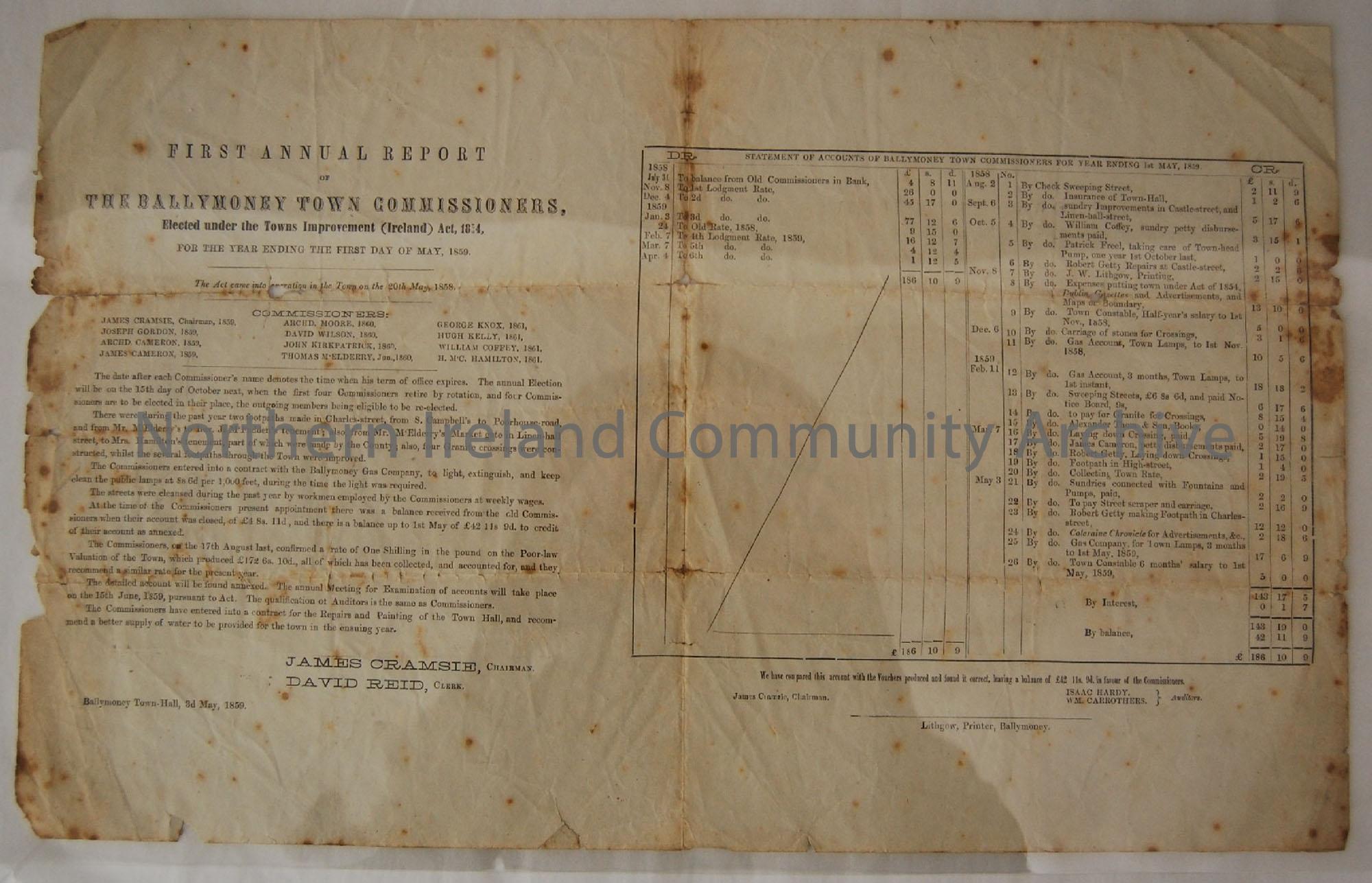 First annual report of the Ballymoney Town Commissioners, for the year ending 1st May 1859. folded out double spread. Includes statement of accounts
