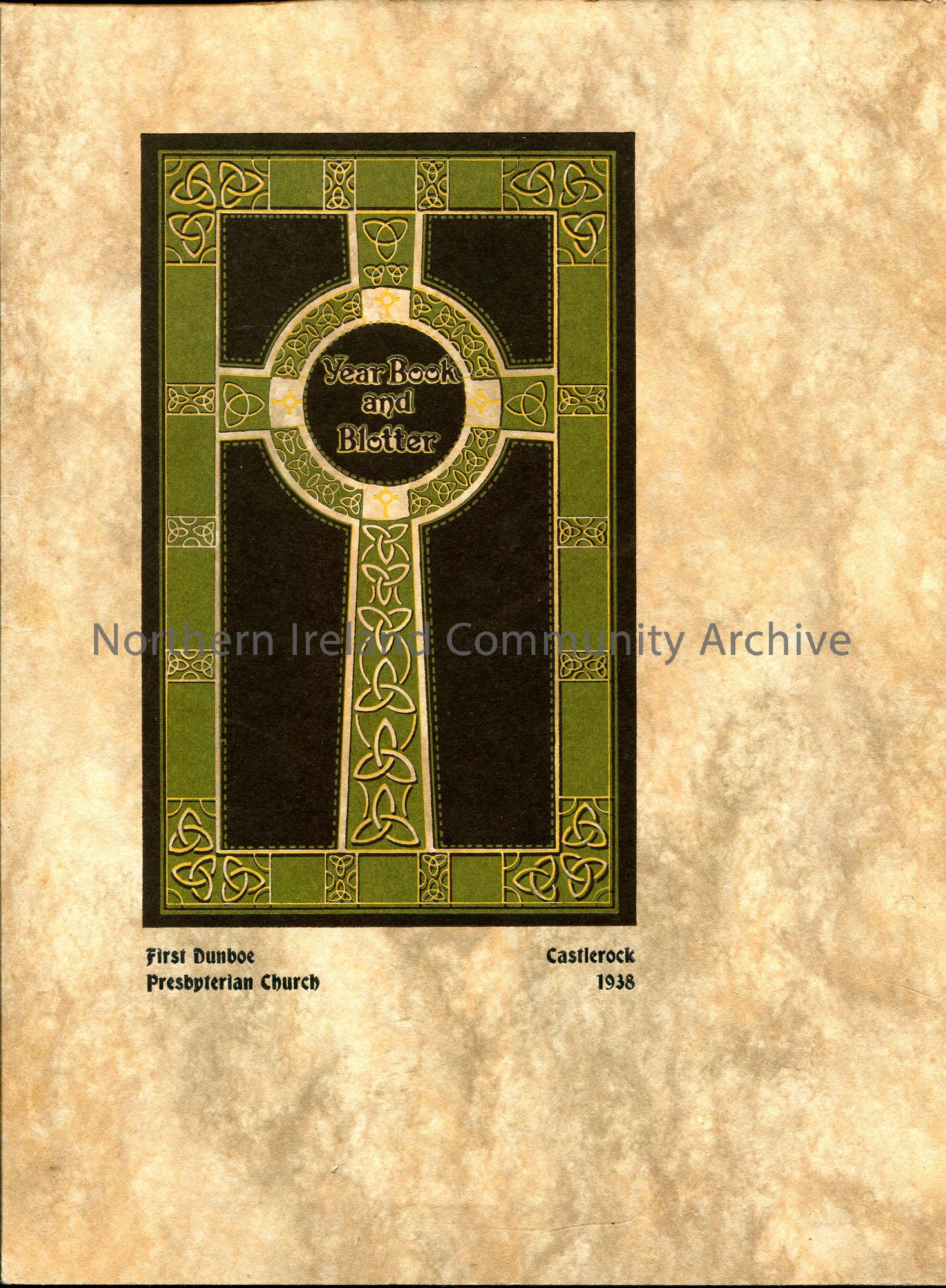 First Dunboe Presbyterian Church, Castlerock Year Book and Blotter, 1938. Inside is an attached leaflet titled, 'Congregation of First Dunboe Castlerock' by Minister Rev. James Mark, 1937. An outline of the history of Presbyterianism in Ireland also attached. Advertisements for businesses in Coleraine printed on inside cover.