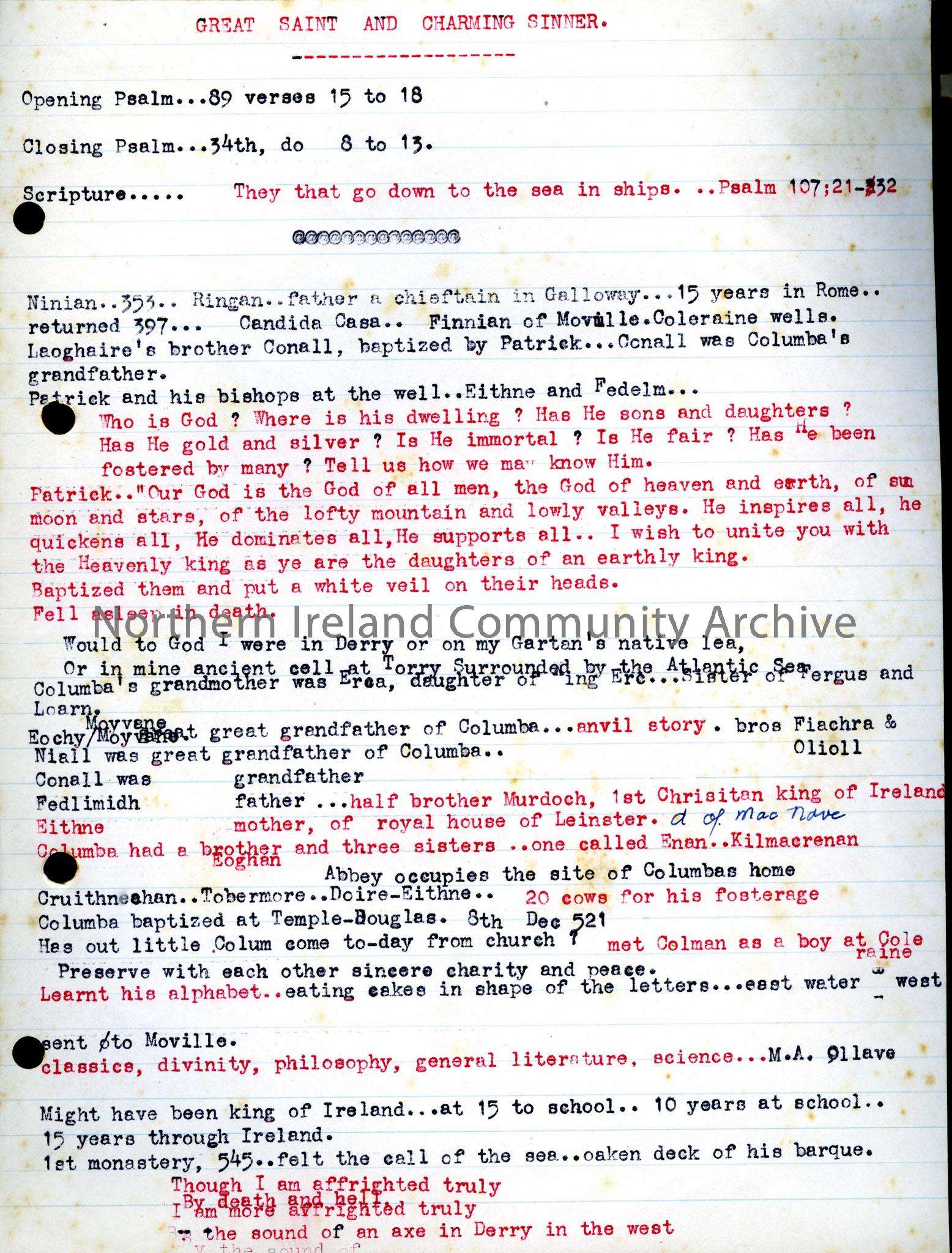 First page of notes that seem to be for a talk entitled "Great Saint and Charming Sinner". The talk may have been delivered in a church as there is an opening psalm, a closing psalm and a scripture reading listed. The theme of the talk appears to be the life of St. Columba and gives some genealogical information.