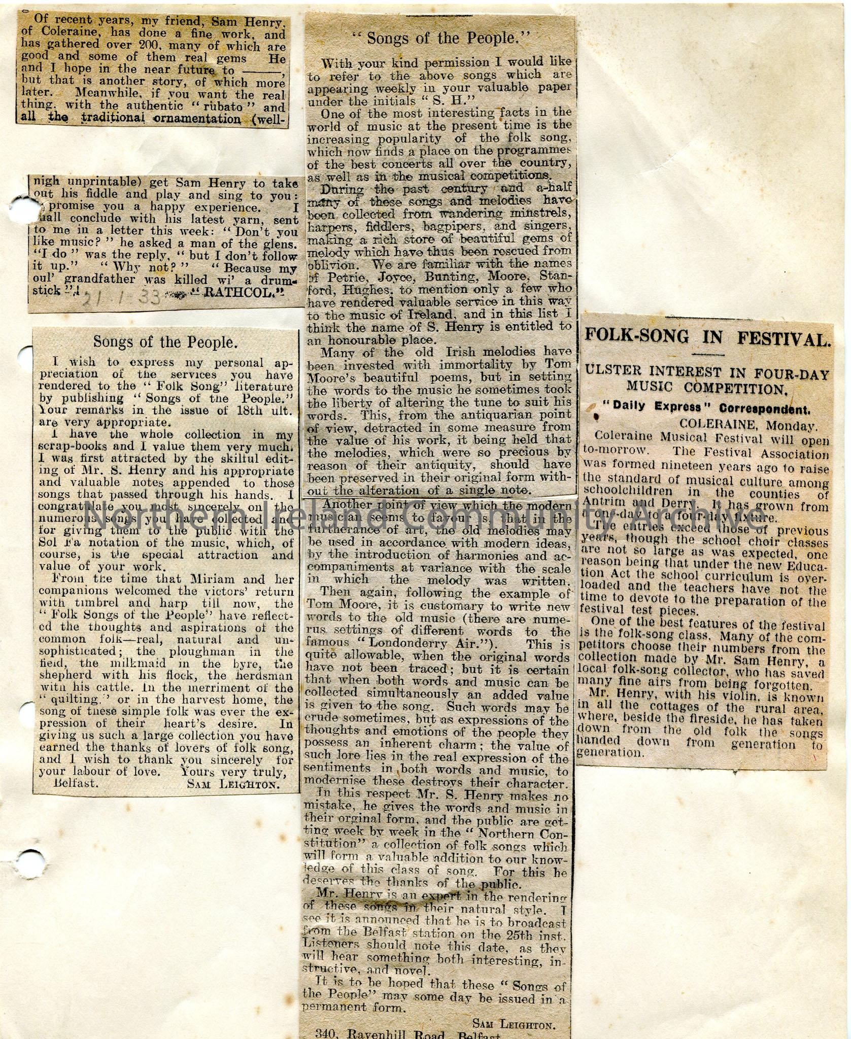 Five articles cut from newspaper, on the newspaper publishing the weekly ‘Songs of the People’. Refers to Sam’s practice of taking his violin to house…