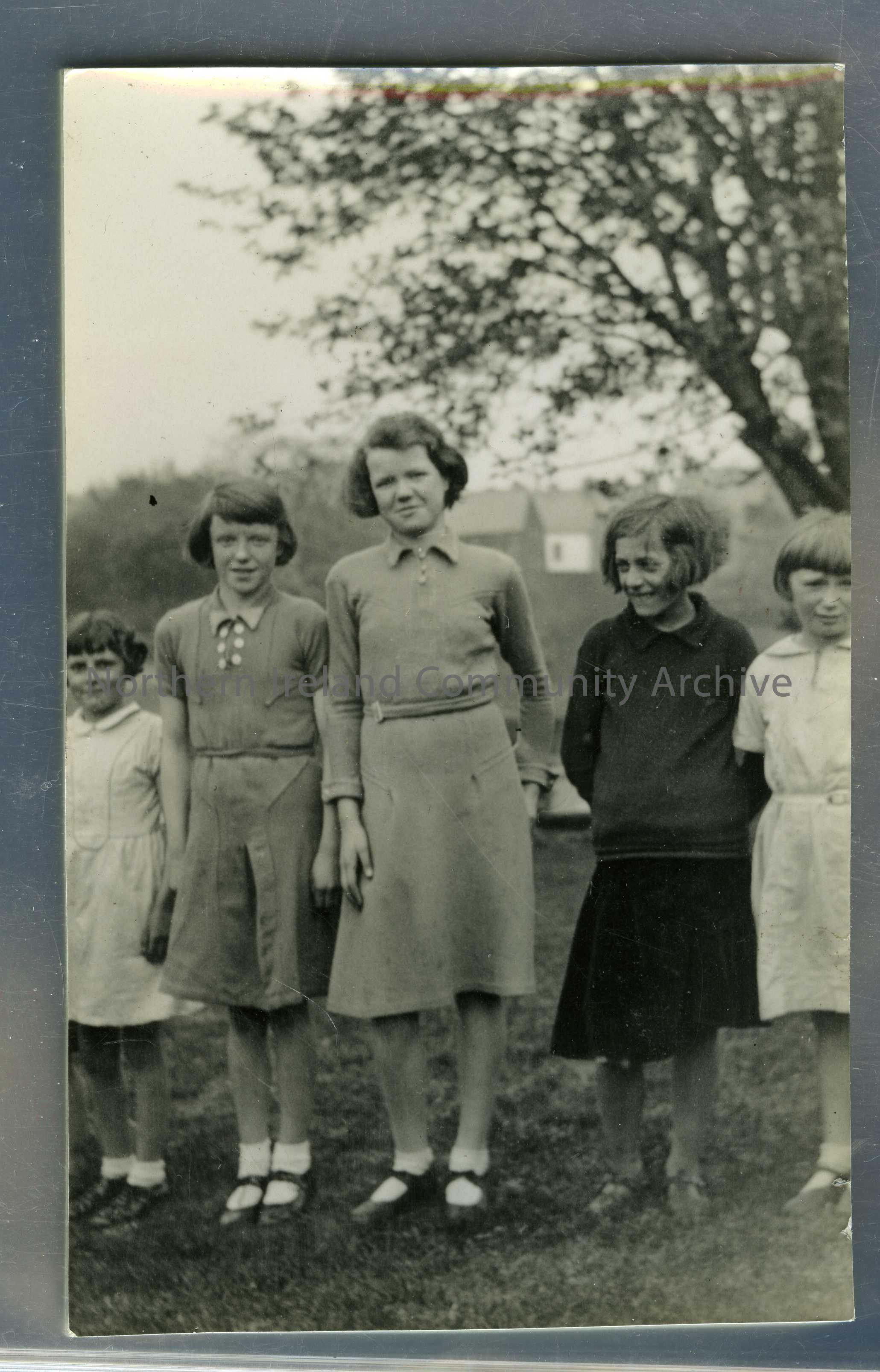 Five children standing together in a line on grass. Typed captioned on reverse, ‘Singing game – “Mrs McAloney” sung by Coleraine Children in the park….