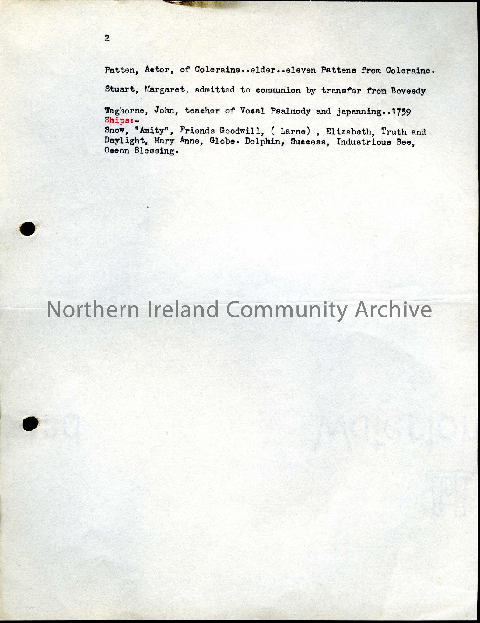 Five typed pages of notes titled ‘Bann Valley Exodus’. 1718 Aghadowey emigrants with Clergyman Rev. James McGregor. Lists emigrants. – Scan110