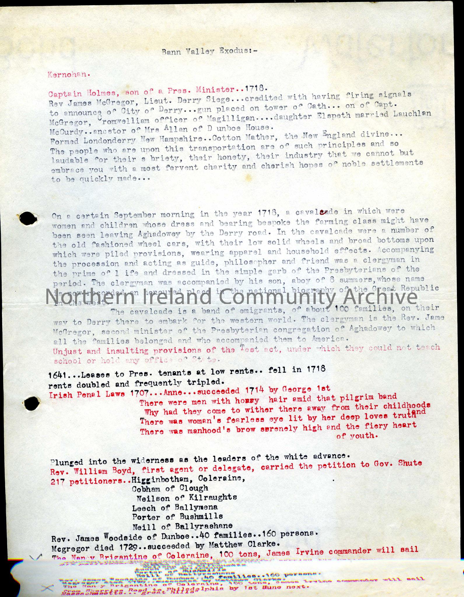 Five typed pages of notes titled ‘Bann Valley Exodus’. 1718 Aghadowey emigrants with Clergyman Rev. James McGregor. Lists emigrants.