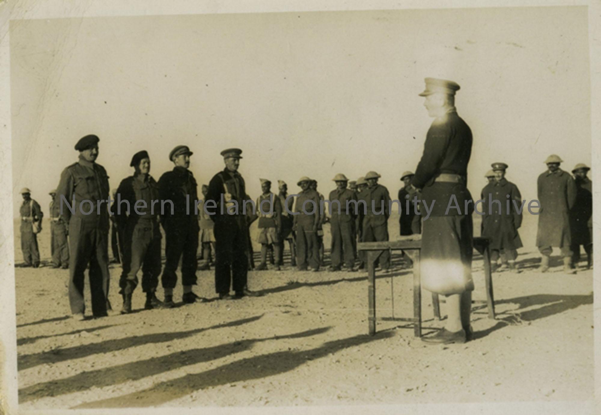 Captain Martin Jackson receiving the Military Medal from the Commander, Force "E", Brigadier Reid. Flanked a row of soldiers.