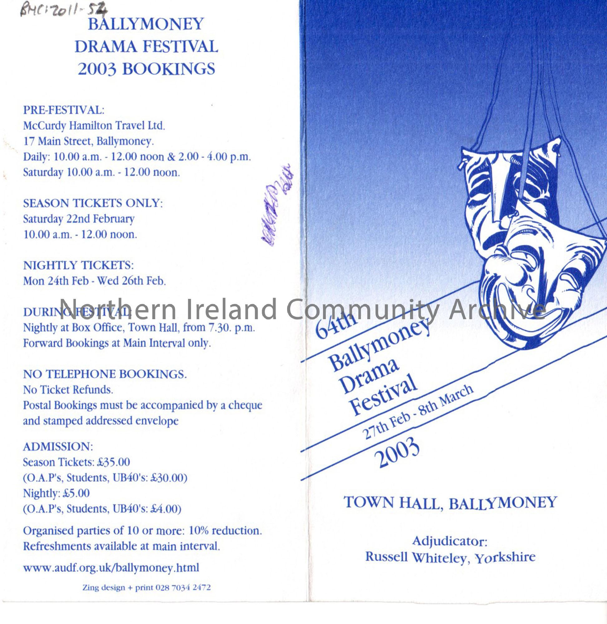 flier for the 64th Ballymoney Drama Festival 27th February to 8th March 2003