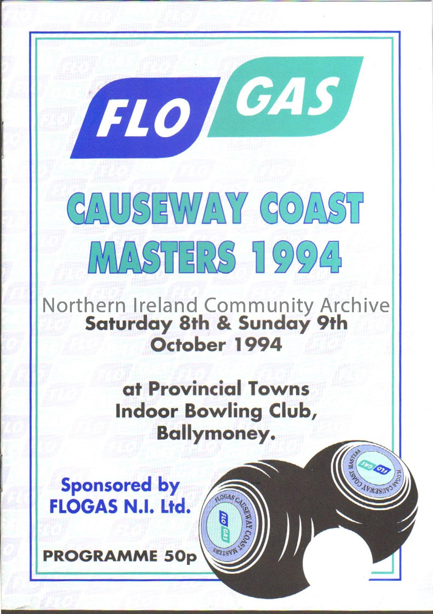 Flo Gas Causeway Coast Masters 1994. Cover has Flo Gas blue and green logo faded as a background and an image of two bowls and a jack in bottom right …