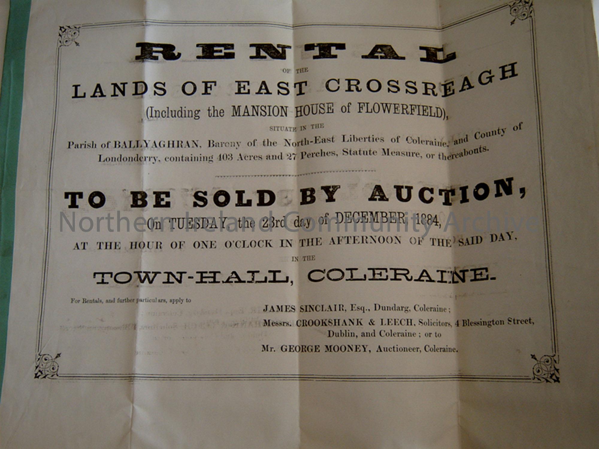 Advertisement for the rental of lands including including the Mansion House of Flowerfield, to be sold by auction, on Tuesday the 23rd of December 1884 in Coleraine Town Hall.