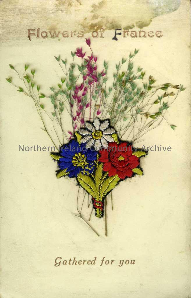 ‘Flowers of France Gathered for you’. Front features embroidered and real flowers. On the back is written in pencil ‘with love Jim’
