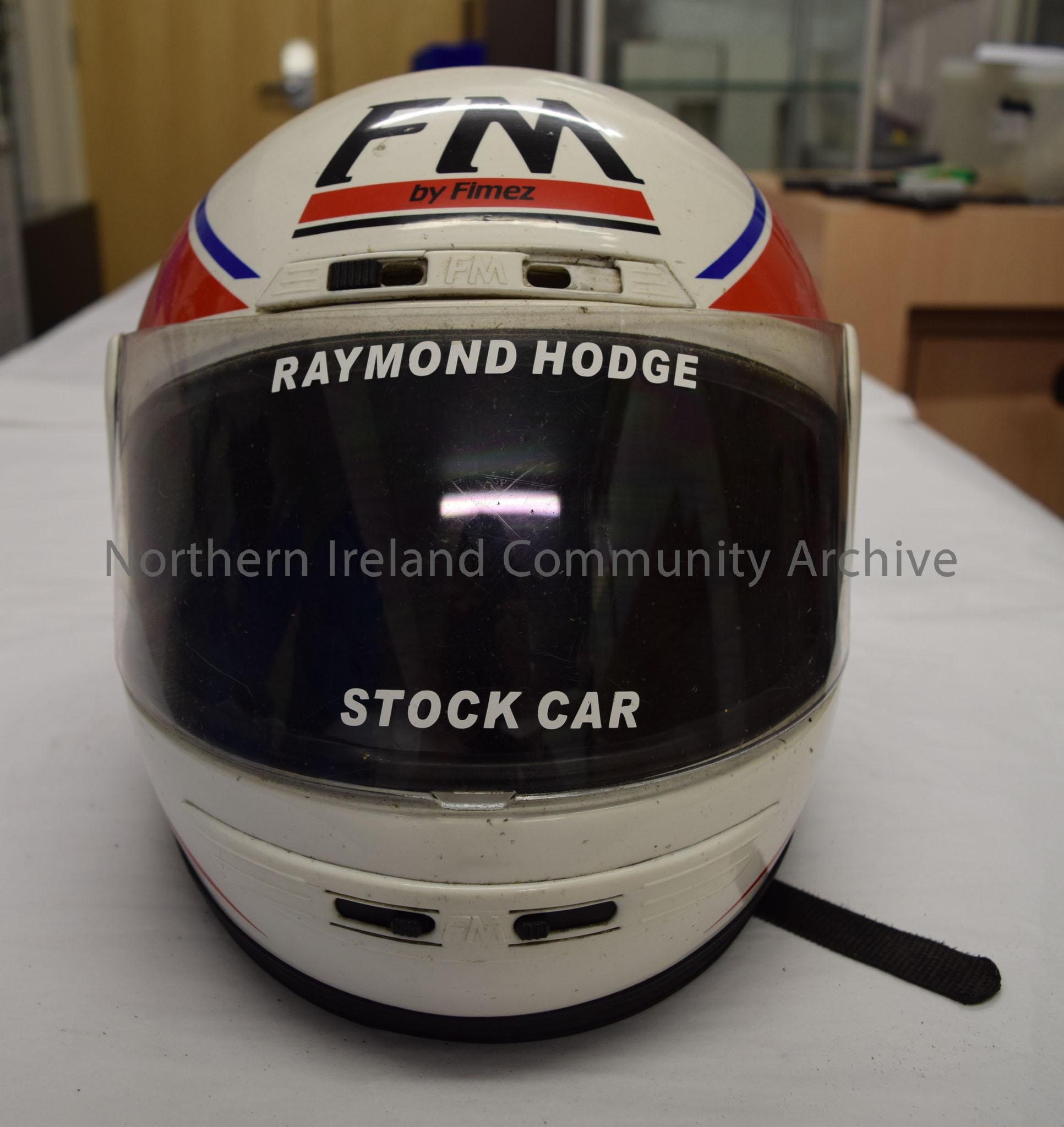 FM by Fimez stock car helmet belonging to Raymond Hodge. White with a blue, red and black pattern on the sides.