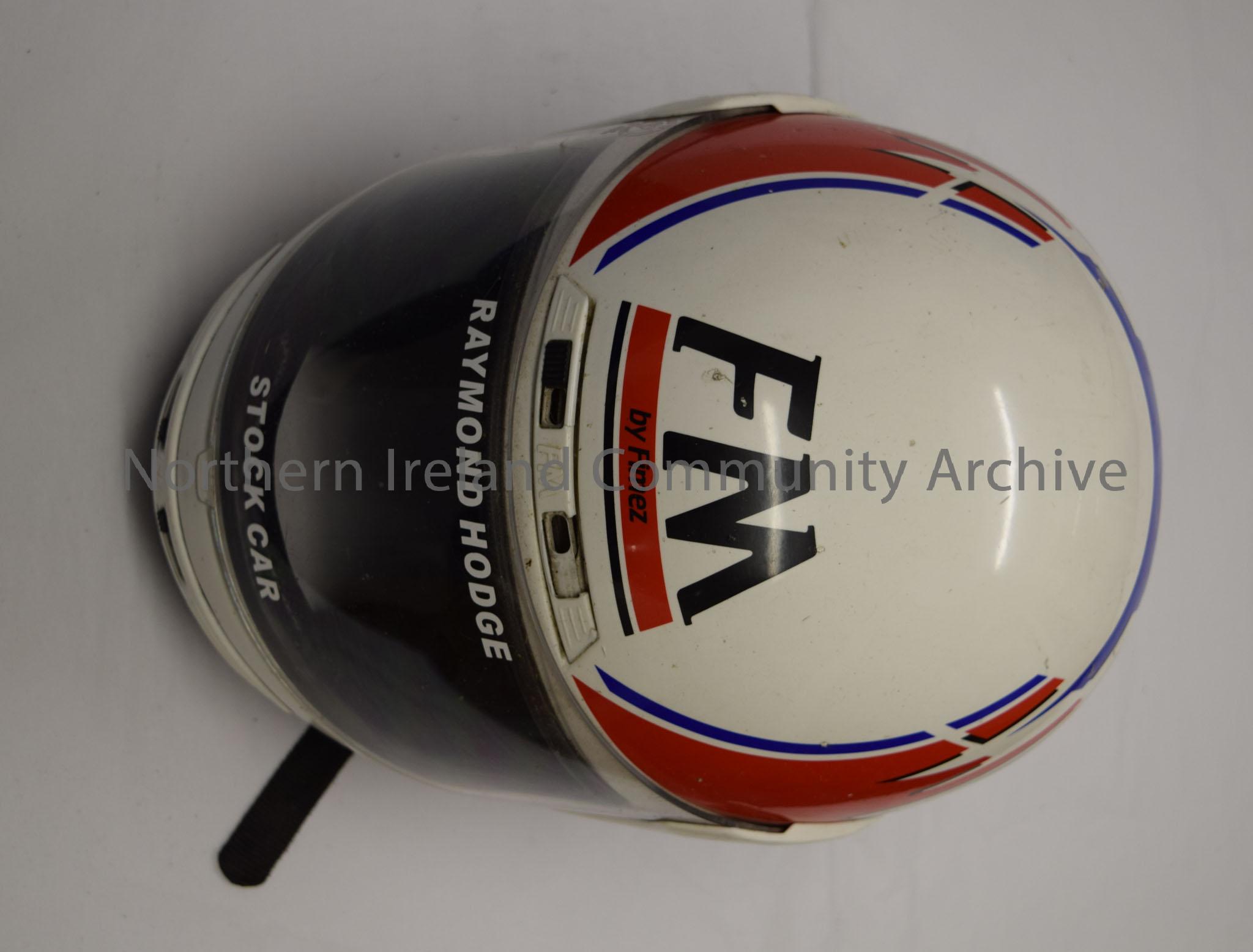 FM by Fimez stock car helmet belonging to Raymond Hodge. White with a blue, red and black pattern on the sides.