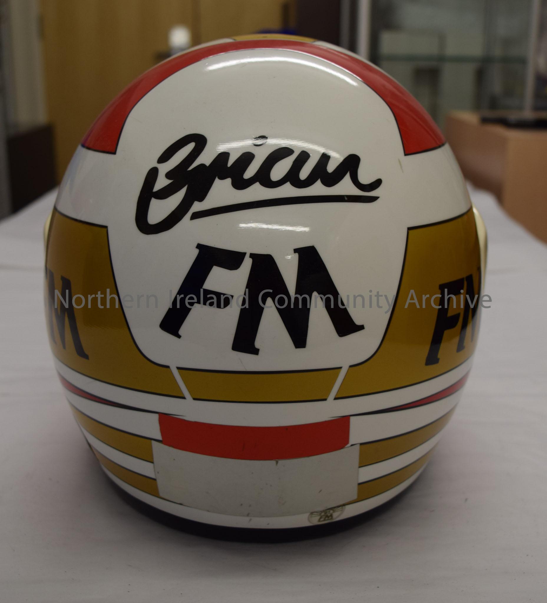 FM motorcycle helmet belonging to Brian Morrison. White helmet with gold and red pattern and gold and red stripes along the bottom. FM written in black in the middle at the front.