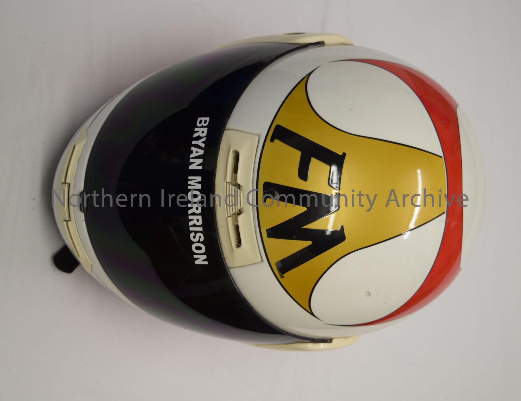 FM motorcycle helmet belonging to Brian Morrison. White helmet with gold and red pattern and gold and red stripes along the bottom. FM written in black in the middle at the front.