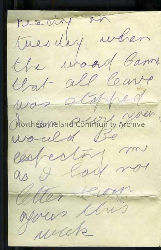 Folded double page of handwritten letter from James to his father. All leave suspended – confined to camp for 3 days – will not be home for 12th. – 31b