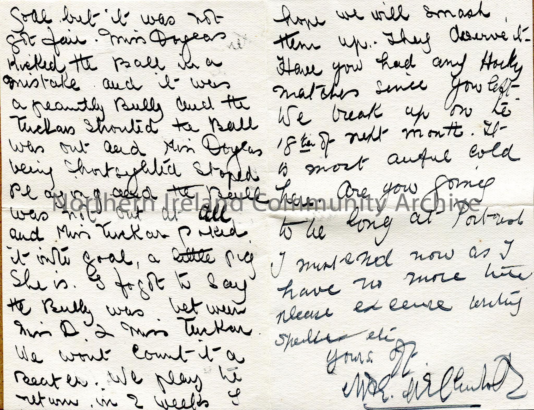 Folded double page of handwritten letter in ink, with stamped address at heading. Addressed to ‘Dear Emmy’. Describes hockey match. Breaking up on 18… – img136b
