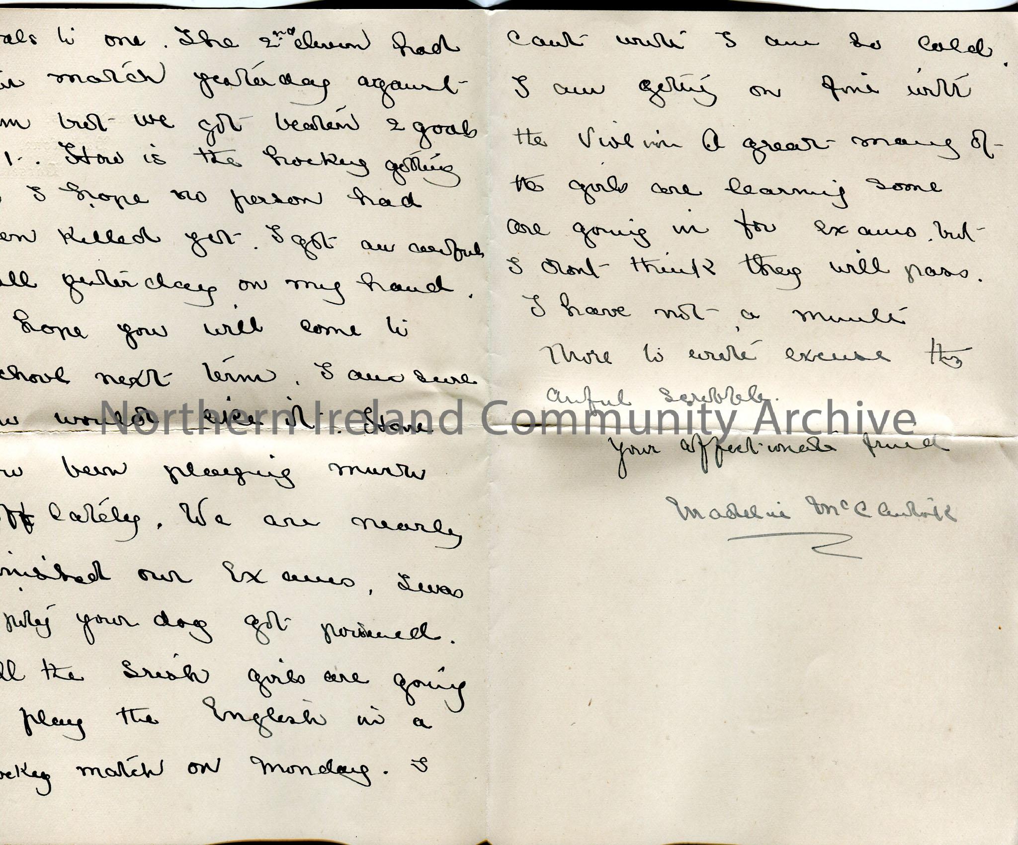 Folded double page of handwritten letter in ink, with stamped address at heading. Addressed to ‘Dear Emmy’. School about to break. Describes hockey ma… – img133b